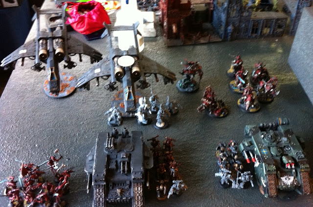 I had never seen anyone surround the base of a flyer to prevent a squad inside from disembarking so that caught me off guard and Abbadon never got to do his thing either… so basically I had to fight this battle without five of my heavy hitters (Abbadon-Mournival, Skulltaker-Herald-Bloodcrushers).