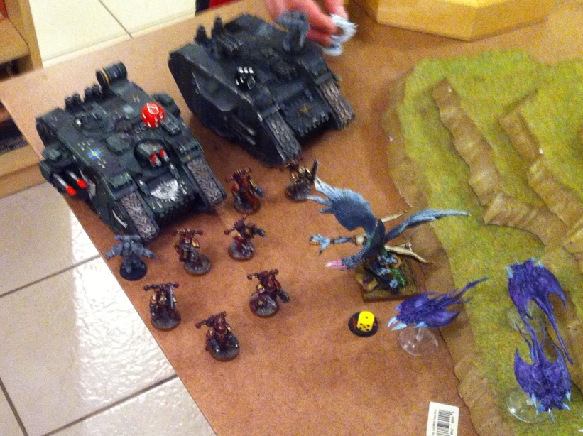 I had never seen anyone surround the base of a flyer to prevent a squad inside from disembarking so that caught me off guard and Abbadon never got to do his thing either… so basically I had to fight this battle without five of my heavy hitters (Abbadon-Mournival, Skulltaker-Herald-Bloodcrushers).