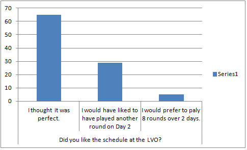 So again, and not surprisingly, most folks like playing less games and having more free time. We had a number of folks that wanted to jump up to a third round on Saturday and I think that is a good idea as it allows us to scale up above 256 players and it means you can lose a game and still make the finals which helps to keep people engaged.