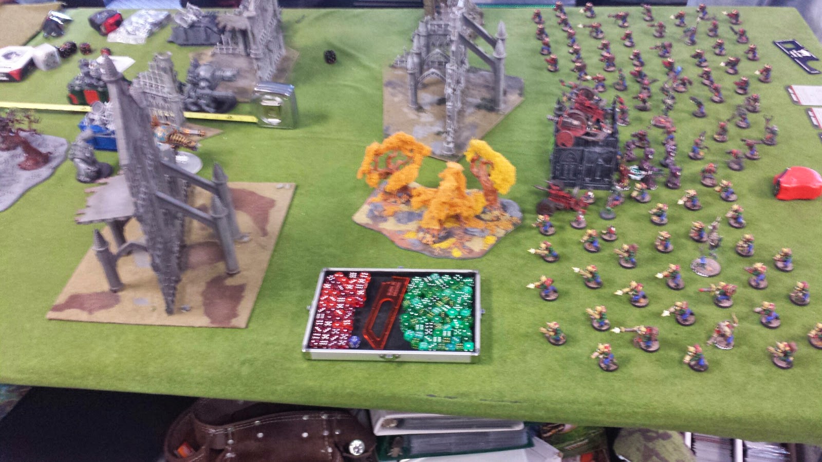 I attended a team tournament at Dirty Goblin Games this past weekend. With a thousand points each, I brought my Star Eagles with six combat squads in Drop Pods and two Librarians. My buddy, Skip, brought some of my Orks which were basically a Green Tide list with two Warpheads.
