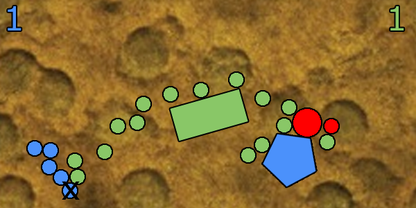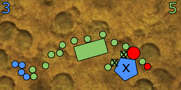 Imagine a Battlewagon full of 19 ‘Ard Boyz (with a Power Klaw Nob) and Mad Dok Grotsnik. These are represented by our green rectangle in the image above. We’ve also got a Space Marines Drop Pod and a Combat Squad of Tactical Marines (represented by the blue pentagon and circles respectively).