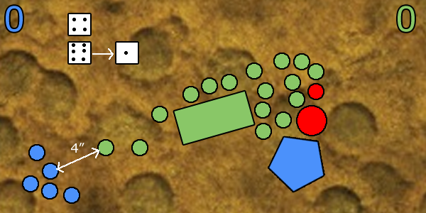 Imagine a Battlewagon full of 19 ‘Ard Boyz (with a Power Klaw Nob) and Mad Dok Grotsnik. These are represented by our green rectangle in the image above. We’ve also got a Space Marines Drop Pod and a Combat Squad of Tactical Marines (represented by the blue pentagon and circles respectively).