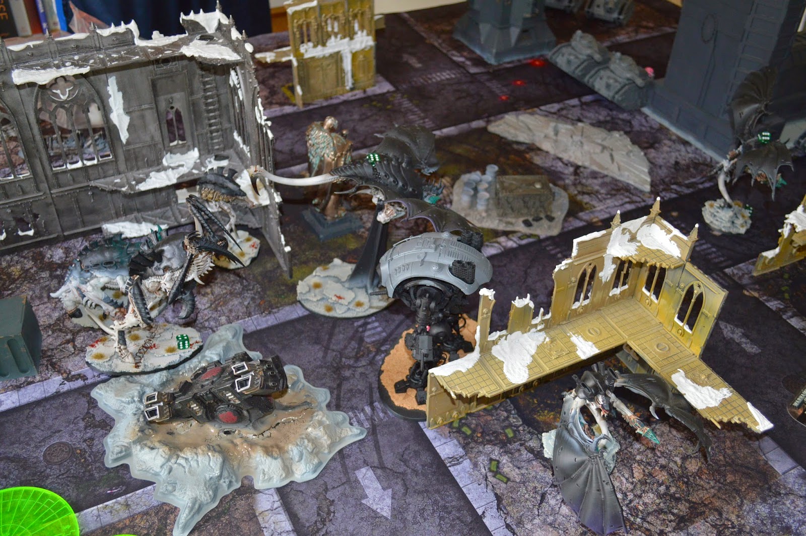 AV14… ah fuck. Not good for me at all. I was not confident in my list bringing this one home, especially looking across the field at 9 big tanks and a knight. My workhorse Flyrants definitely have a lot of work cut out for them in this game. The knight will be the key player for the Steel host’s side and will need to cause as much disruption as possible in the early stages of the game, so theres primary target number 1 for me. I win the roll to set up first and take the first turn.