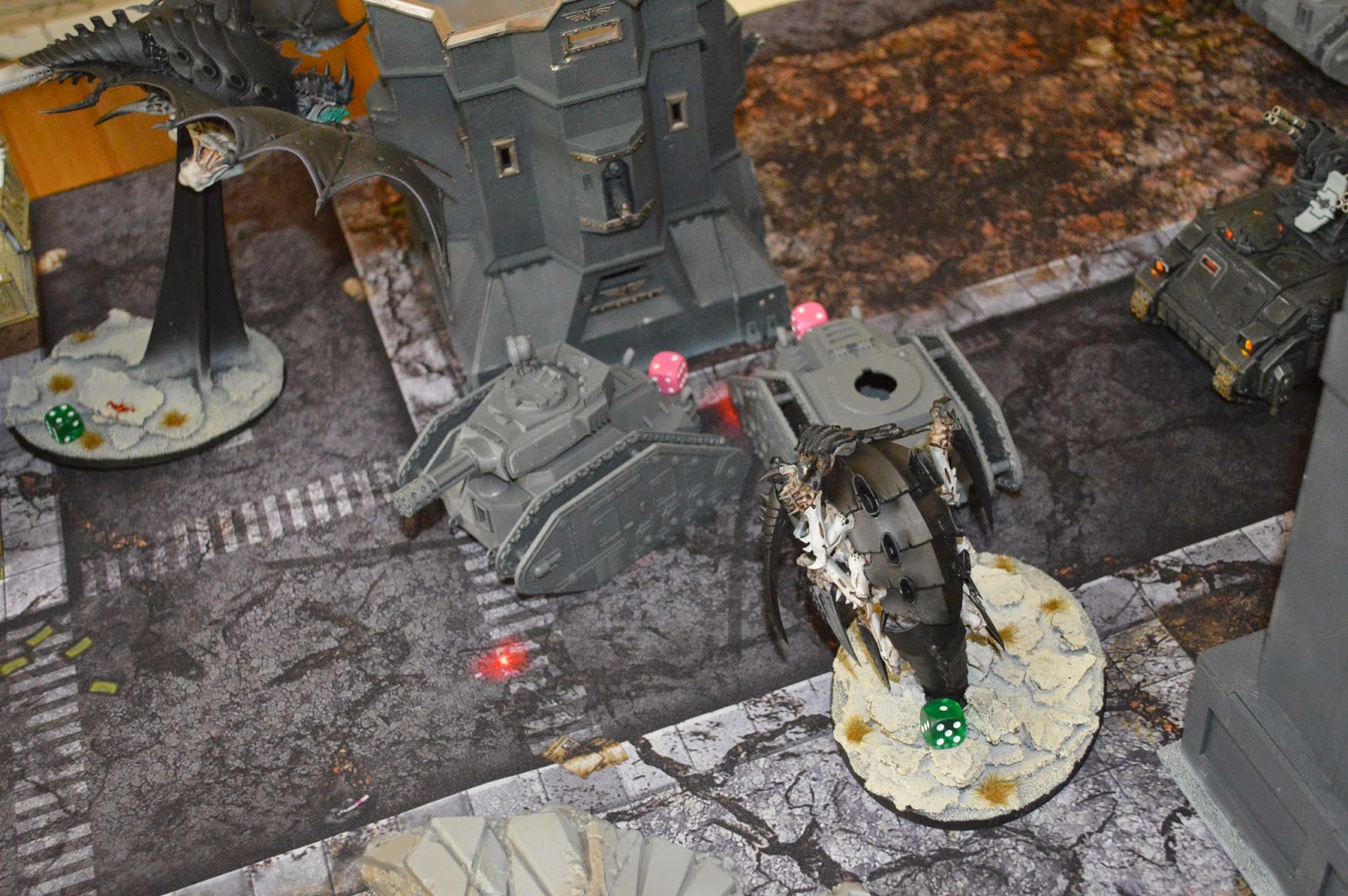 The second Mawloc shows up, I bring him on in the IG deployment zone but in the safe, less busy side. The Flyhards ( New name, they have outgrown the measly status of Flyrants.) head over towards the Leman russ’s whilst the Mawloc worms its way over towards the last executioner. The Hive Crone re-enters play over on the left flank and fires the last of its haywire missiles at Pask’s Punisher, taking off 1 HP.