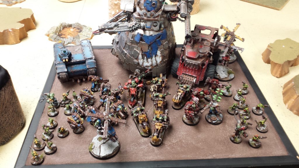 Round one I got to play a local player Daniel, whom I hadn’t played before but was excited to see what I could do. He was running a Stompa with a big mek, small Snarf Snarf (Zardsnark) squad, Battlewagons with Lootas and Nobs, 3 Deffkoptas, and Grots.