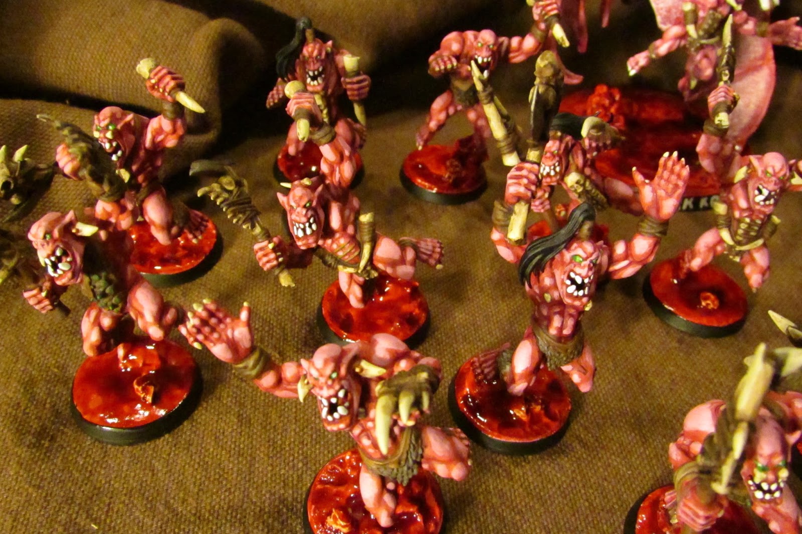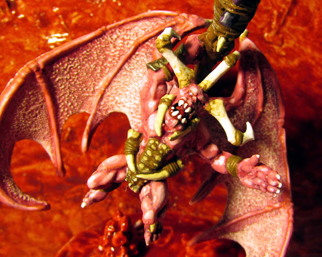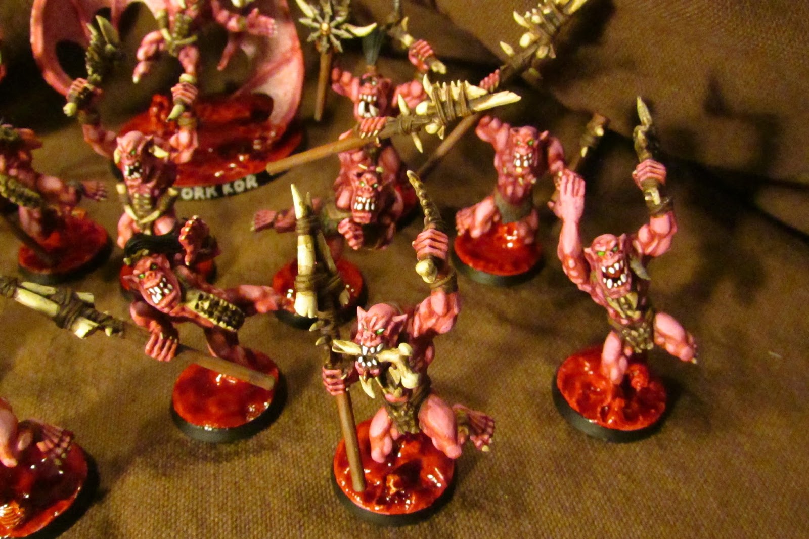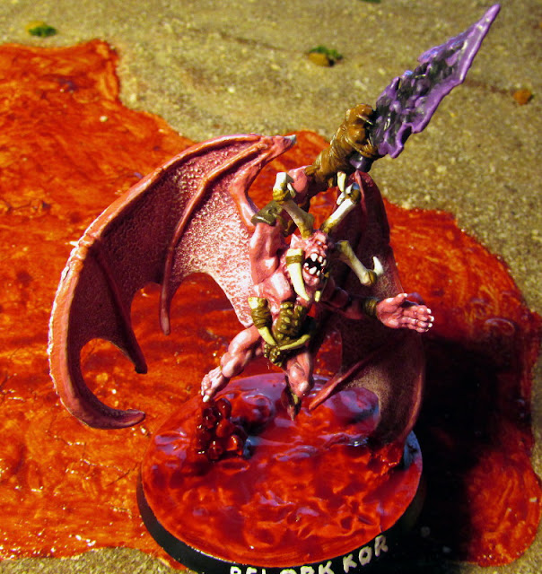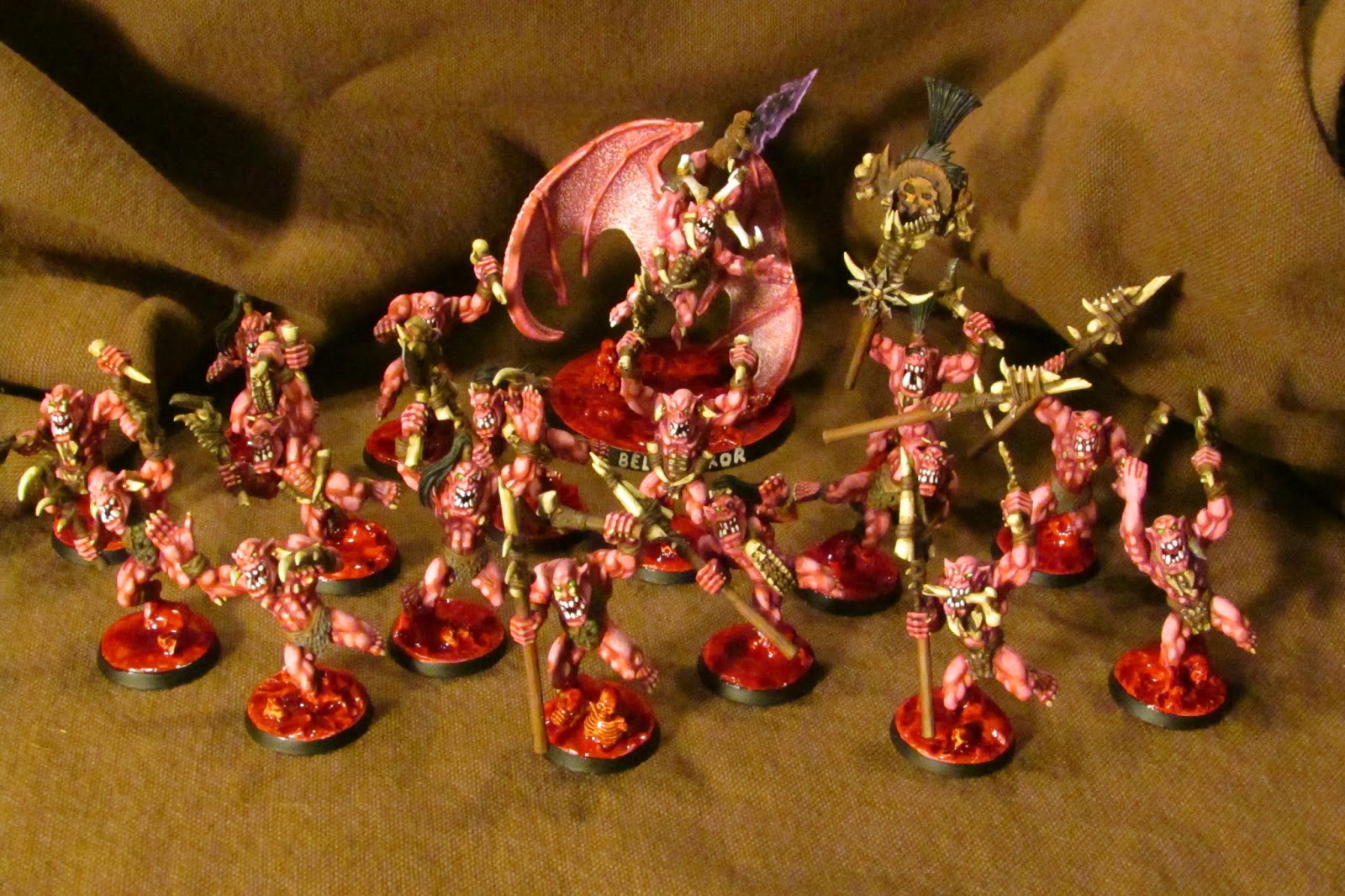 Of course, Belakor is a psyker, so really has no business looking like a daemon of Khorne, so I painted Bel Ork Kor kind of Albino-y, sort of like a big pink horror. I think his pose and size matches up with the real Belakor model pretty well. What do you think?