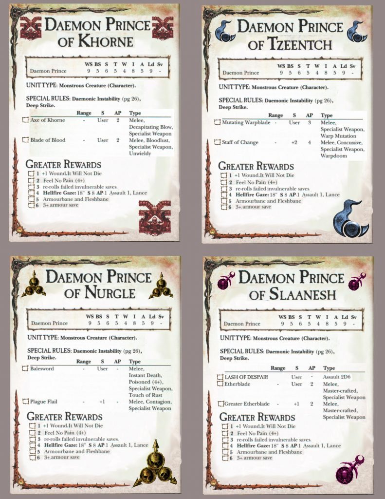 Even one prince can do a great deal of damage, especially if you got ‘Iron Arm’ or ‘Warp Speed’. In one game, I had the Nurgle Prince with ‘Iron Arm’ up assault a C:SM Chapter Master wielding a Thunder Hammer and Shield of Eternal joined by three Assault Centurions. In the assault the chapter master was ground into fine red paste, and in my opponents turn the prince doubled out all three centurions — consolidated and proceeded to run 2 more Riptides off the board before the game ended.
