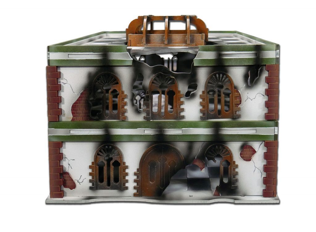 The Damaged Urban Square is a great looking terrain piece, and comes with two levels and a base. You can create two, one story buildings, a single 2 story building or add in an Urban Square Balcony Level to create a 3 story building. You can also stack this kit with other Damaged Urban Square Buildings or the undamaged Urban Square Buildings to customize your table.