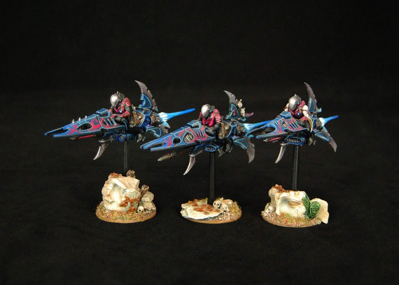 Reavers are typically taken in unit sizes of either three or six. Three-model units excel at taking objectives assisting in assaults, and sneaking in a lance attack on a flank. Six-bike units are full-fledged multi-role units in themselves and will serve almost any Dark Eldar list well. The Arena Champion starts becoming useful at this point just to keep the bikes on the map. Be prepared for six-Reaver units to become a serious target however.