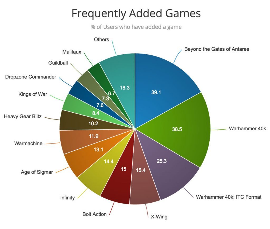 There is some really interesting data to be found here, especially in terms of general popularity. This graph is showing the % of our users who have added a particular game. Beyond the Gates of Antares is currently in the lead, their community was the first to adopt RUMBL, and they have been very supportive of the platform so far. Right on it’s heels though is the behemoth Warhammer 40k, and Warhammer 40k: ITC Format, which we’ve included separately, due to it’s popularity. There is a lot of overlap with the two, so combining them into one doesn’t do the other games justice (most ITC players also registered for standard 40k). X-Wing also has an amazingly strong showing, coming up right behind 40k, despite us not publicizing it directly to X-Wing players. From there Bolt Action and Infinity have strong showings, and surprisingly we have more players registered for Age of Sigmar than Warmachine, maybe people do play it after all!