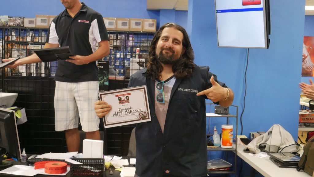 I would also like to give a special shout out to Matt Barlow for not only getting best Tyranids but also being 1 perils, and failed grounding test away from making the top table and competitng against Matt Root for the championship. Also, there were two Blood Angels players in the top 16 with a 5-1 record. Danny Kwan, and David Hetherington. Guys I want your lists! You seem to be the only players whose lists I don’t have. So if you can, shoot them over to