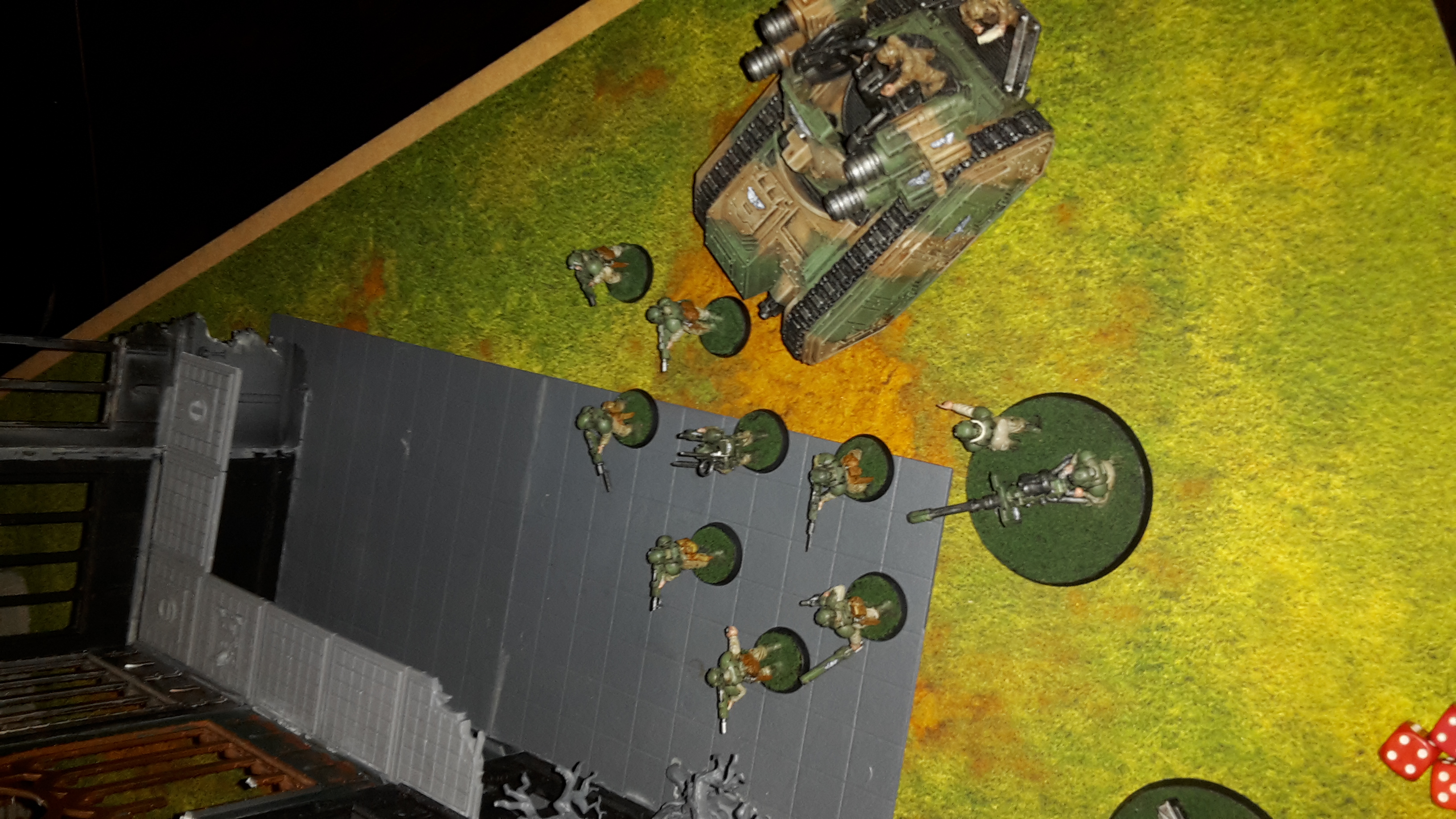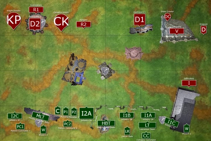 Infantry Squad 2C and platoon command 1 advanced on the Knight Paladin, the Veteran’s Chimera advancing at full speed to block the advance of the Knight. Pask led his Punisher tanks forward to support the advance of the combined Infantry squad.