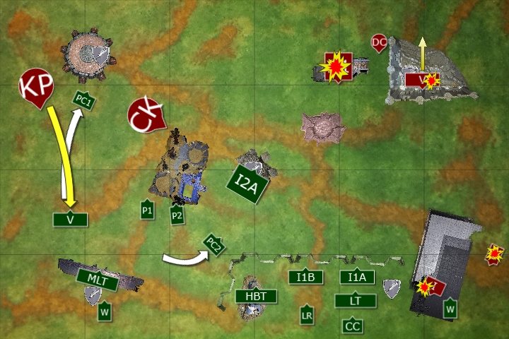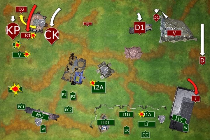 One of the Wyverns fired at the Rangers, the explosive shells killing 6 of the unit. Pask ordered his unit to split fire, his own tank targeting the Destroyer unit and killing two of the squad, the second Punisher killing two of the Rangers. Infantry Squad 2A were ordered to fire on the Rangers and then advance, they killed one of the squad and ran towards the middle objective. The Rangers passed their morale check, but the single Destroyer failed his morale check and fled.