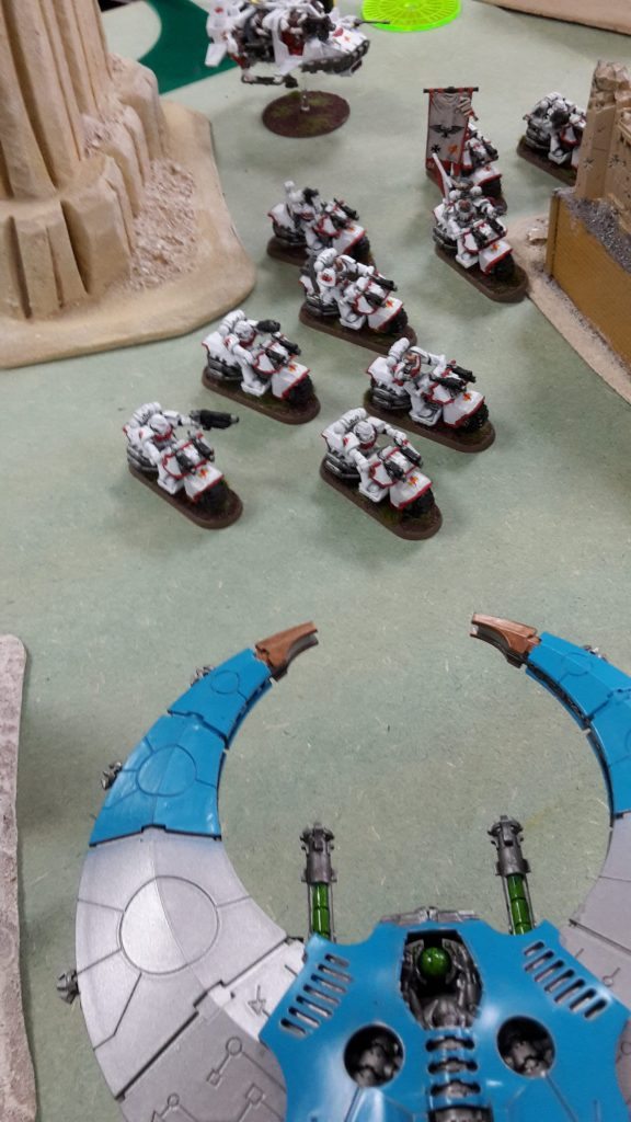 The Night Scythes advanced on the Relic, the two squads inside disembarking to engage the bikers (I did not know they could do this!). The Necron Warriors on the left flank advanced on the warriors.