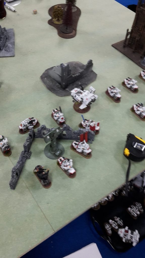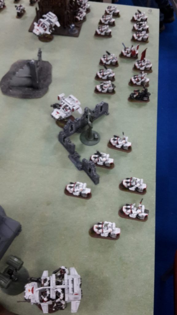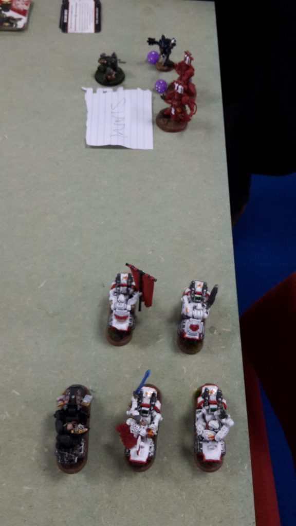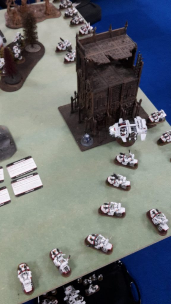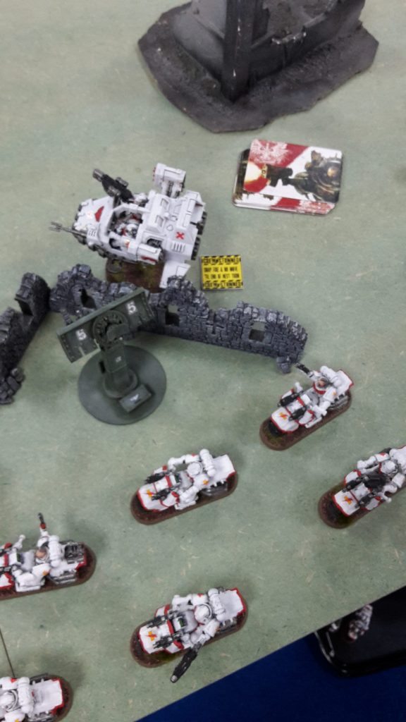 I was really hoping not to go up against a multiple Knight army in this tournament. To make matters even worse, they would be invisible and have ignores cover shots (thanks to phaseform), so the battle cannon and two Gatling Cannons would shred my bikers without their Jink saves. Fortunately, the three Knights were a single unit, which would limit them somewhat.