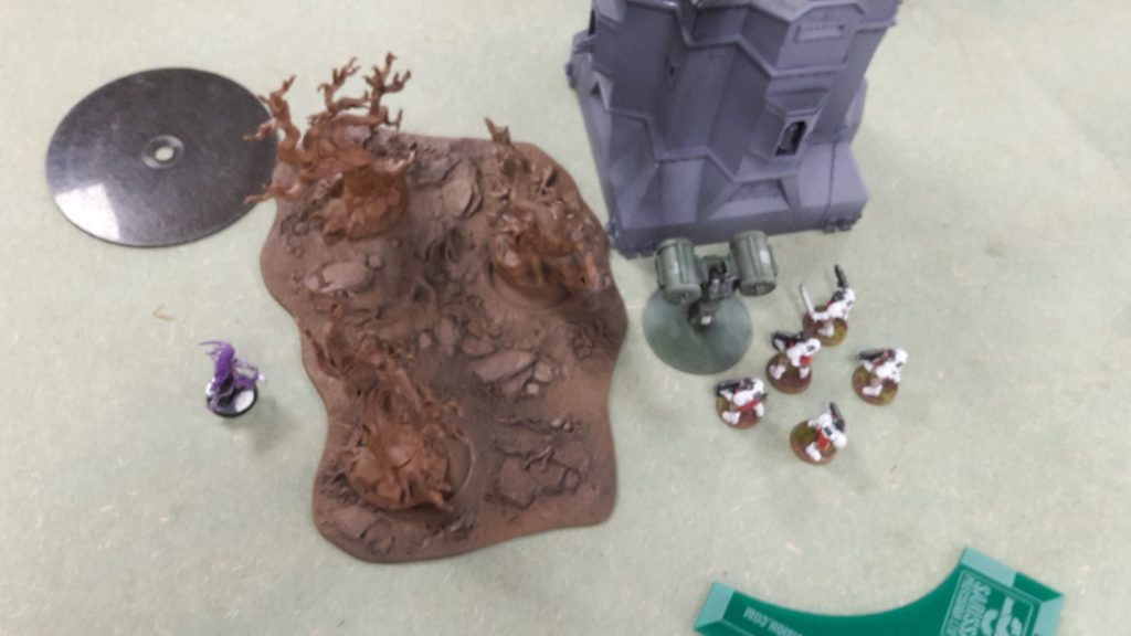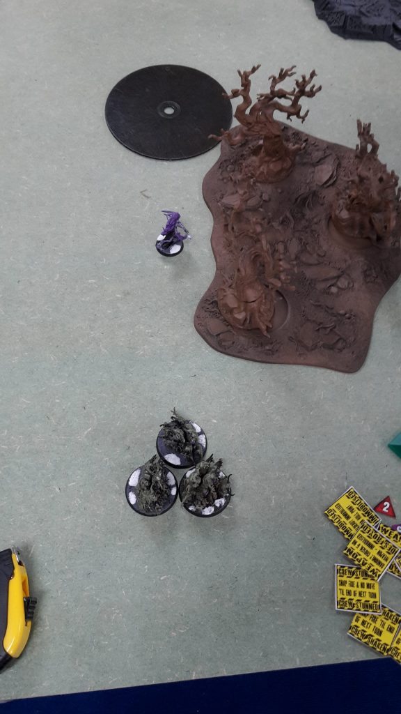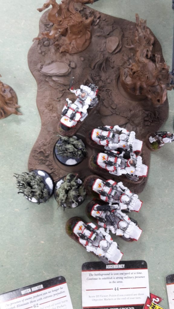 The Nurglings arrrived, appearing from the warp in front of the White Scars’ main objective. The Knights moved up on the Bikers in the forest.