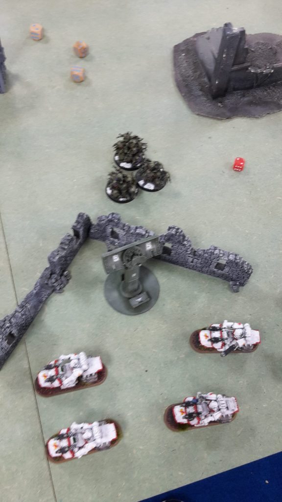 The Knights opened fire on the bikers in front of them with a missile pod, wounding one but failing to get past the biker’s armour (I think this was the first armour save I got to make the whole game!). The second missile pod fired at the Scout Biker, hitting him but failing to wound.