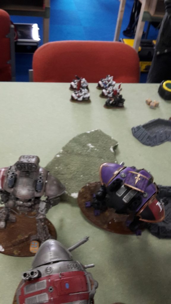 In the assault phase, the Knights charged the Bikers in the woods. The Sergeant’s meltabombs took one hull point from a Knight before the unit was obliterated by the Superheavy walkers.