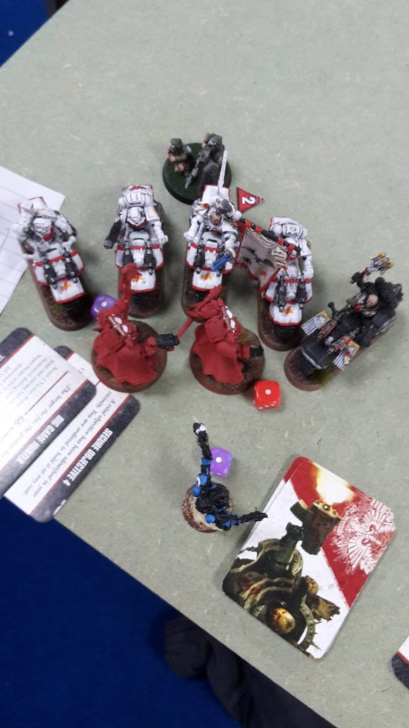 The Command Squad struck at the Conclave, but were unable to get past the Terminator armour of the Librarians. The Conclave struck back, killing one of the Veterans. I lost the combat, but was Fearless thanks to my Chaplain.