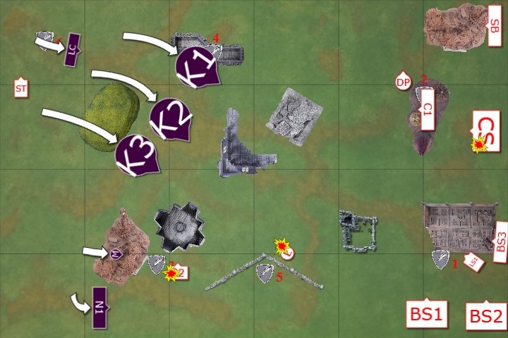 The Knights opened fire on the Scouts holding the White Scars objective, killing the unit. They fired at the Command Squad, wounding Khan once with their Gatling Cannon.