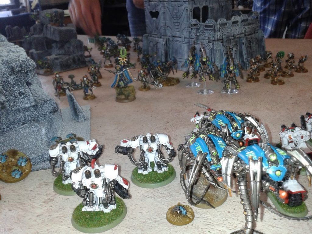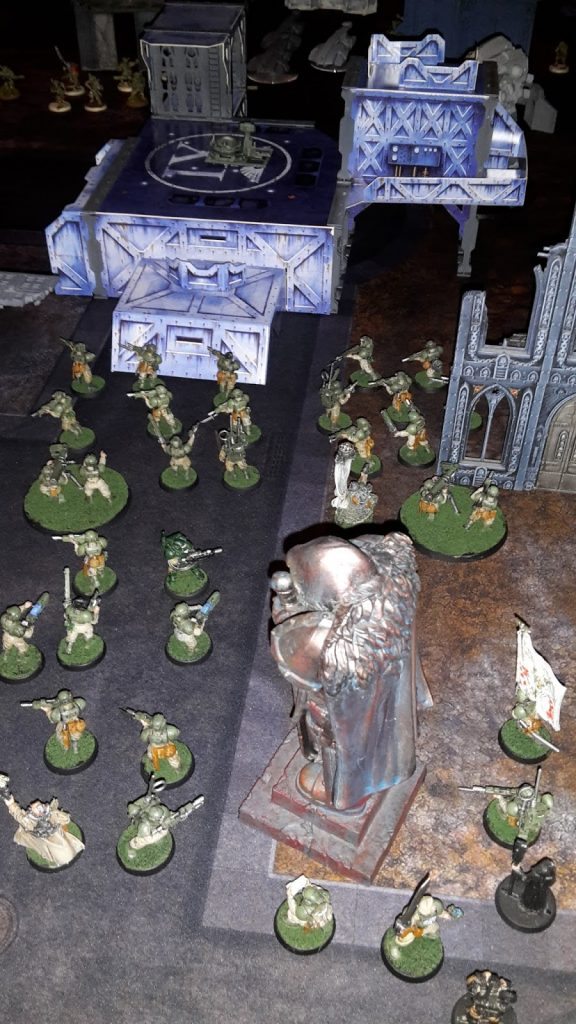 At the end of the campaign I organized a 40K event match. There was a 2v2 game of 1500 points per player and it was a 5 hour timed game. There were other side tables that would play across turns normally like a 1 on 1 match but every 3 turns if the objective was secured that table would throw on an effect onto the main table. Like a cannon table where in the next shooting phase the side which controlled the objective would be able to place a ordnance shot on their next shooting phase. Having each table have their own respective turns; meaning that it each table would not slow down the progress of the main table. I had another table with an objective of escorting models off a table. When a model was escorted off the side that it belonged to would get to bring a dead unit back from the main table. The idea would be to limit the use of other players playing on multiple tables or other players using other player’s models.
