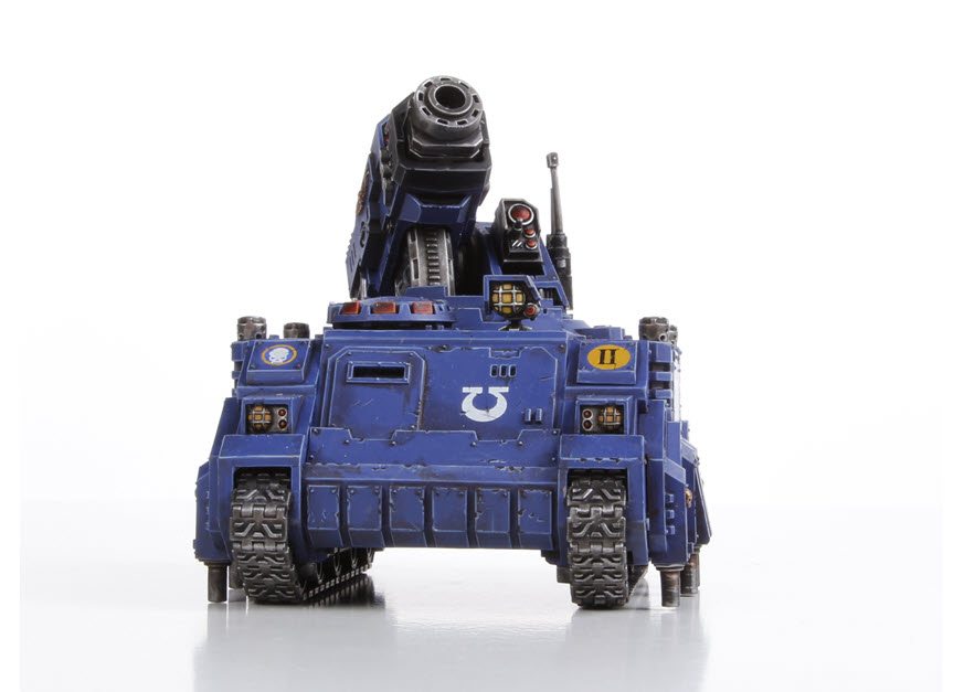 The Hunter is one of two tanks in the Space Marine arsenal with the specific goal of taking out enemy flyers. It comes armed with the Skyspear Missile Launcher, which features a Servitor Savant hard-wired into each missile, giving the term “live ordnance” new meaning. It is based on a slightly tougher Rhino chassis, with front and side armour 12, rear armour 10 and three hull points, all for 70 pts. It has the option to take up to 3 Hunters in one squad.