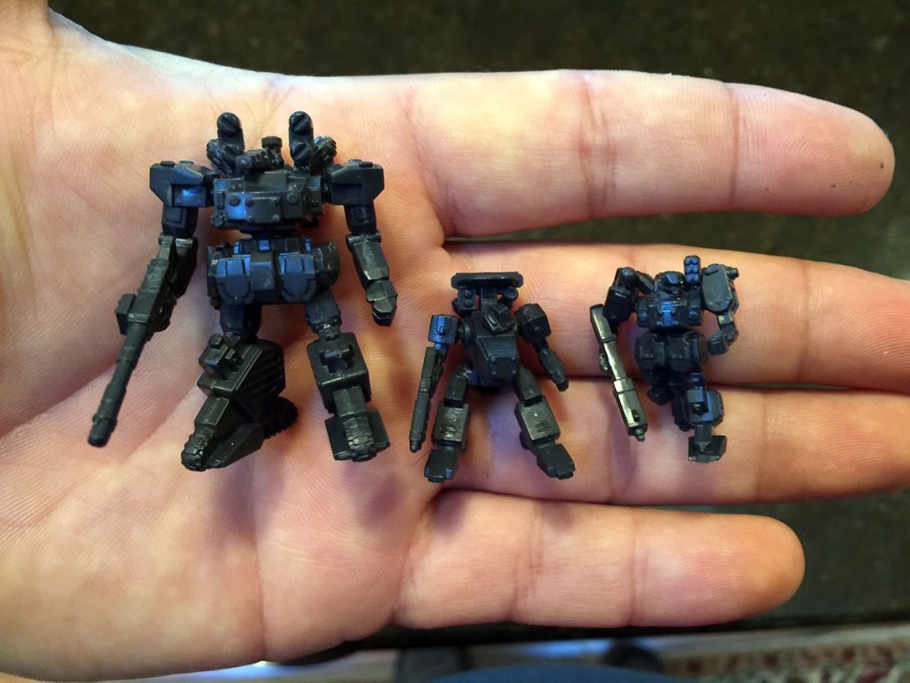 The first thing I noticed when opening the box was just how much stuff I was getting my hands on. Each model comes neatly on it’s own sprue, with a multitude of weapon options for the different load-outs. Each one is cast in a darker, very slightly softer plastic than I’m used to, but are incredibly well detailed for their scale. The first thing I did after opening the box, was getting to assembling a few of my add-on miniatures. They assembled quite easily, though the Ferret and Cheetah (the smallest gears in the game) were a bit fiddly to deal with. My Testors Model Masters plastic glue didn’t seem to work too well, but super glue worked incredibly well, bonding very quickly and sturdy, without the use of accelerant. Here are the first three I made, a Crossbow Grizzly, Wild Ferret and White Cat Cheetah: