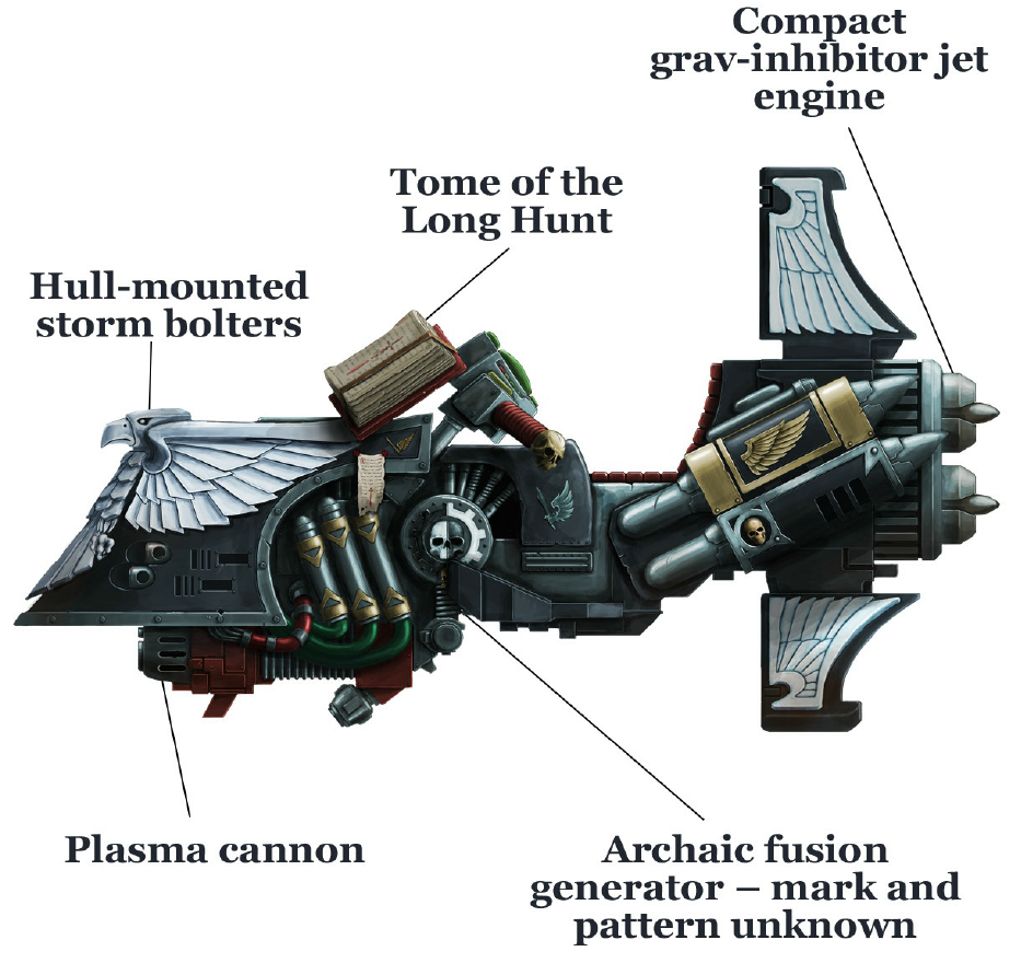 Plus with rear armour 10 and two hull points, he falls so easily in combat. He does have the 4+ invulnerable, but I have seen him fall to a regular bike squad with grenades (pre draft FAQ). For 60 pts less, you could simply take two Landspeeders with Heavy Bolters and Assault cannons, same amount of firepower, double the number of hull points (though not AV14).