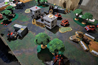 Game 1 had me paired up with Kyle, and his Iron hands in a Sons of the Gorgon decurian. He was running a small Librarian conclave as well as an Armored company and Skyhammer formation. Hello Whirlwinds! We played Cloak and Dagger with Slay the Warlord, King of the Hill and Last Blood. I decided the whirlwinds had to go first thing, they would be able to put to many wounds on the gaunts and prevent them from being able to be effective. So I used the swarm to bog down my table left (top of the picture) and ran the Boy Band on table right to first turn kill a whirlwind and put me in position to kill the second one the following turn. He dropped in a tough Sternguard unit complete with Librarian and Techmarine onto the center of the board (between the two grey buildings in the picture). This would see him earn King of the Hill as I never had the time to dig them out. His Skyhammer pinned in a fair number of my Gaunt units within my deployment zone, leaving me very few options to dig out the center with. We ended up 14/6 my win,