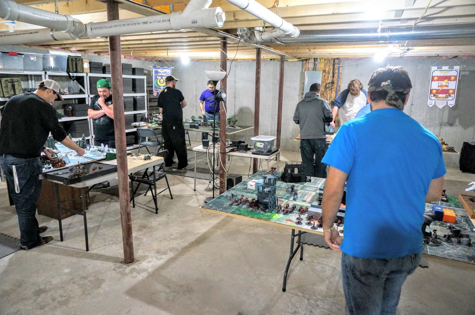 A few weeks back I hosted my first ever tournament for 40k. I’ve moved out to the mid coast of Maine and as such I’m hours from game stores that host events, and a good two hours from the best store in the region that I’ve been going to for some time. We have an upcoming annual event coming up, The Standish Standoff, and my playgroup in the area wanted to get some practice in. I happen to have a pretty large basement, a number of catering banquet tables for work and had purchased a number of sheets of sanded plywood as table tops. We figured on rounding up 6 players, and maybe we would get 8 if we got lucky.