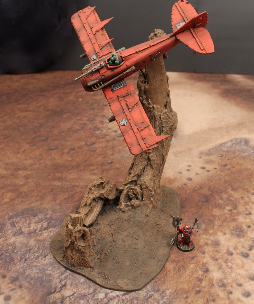 For this table we decided that it would be ideal to design a couple of terrain pieces that would capture the movement and chaos of an Ork assault. We imagined the sky being filled with Ork and imperial aircraft doing battle, while massive roks thunder through the atmosphere to pummel defences and deliver boyz to the front.