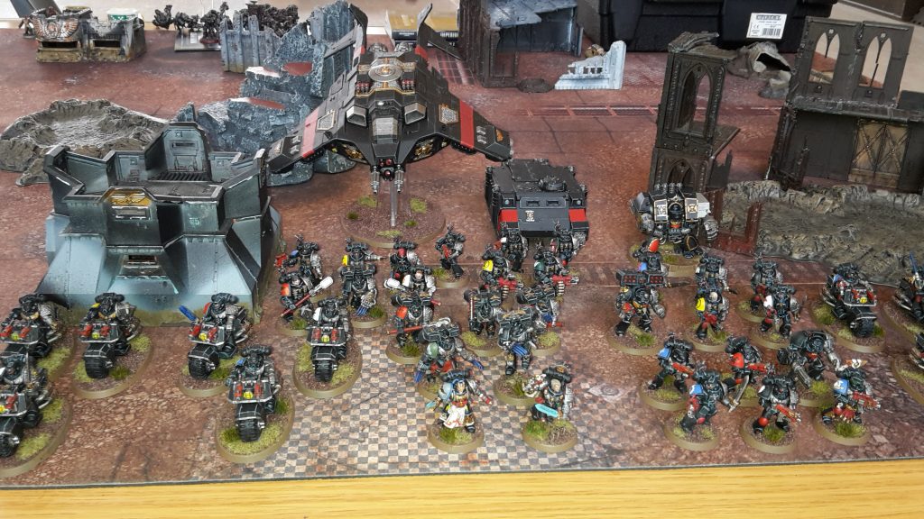 The assault Kill Team, Watch Master and Librarian would go in the Corvus. Hopefully, it would get them quickly into combat to tear up the enemy army. The Vanguard would most likely go in reserve to grab objectives or assault the enemy. Three units of Bikers would give me some good mobility in the army, with two further Kill Teams (with additional Terminator) to give me some objective holders.