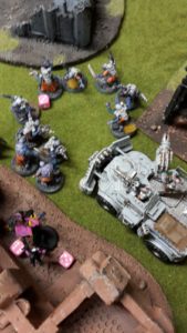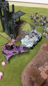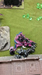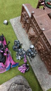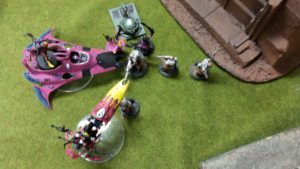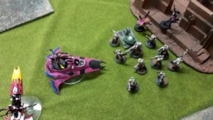 Finally, the Acolytes targeted the Warlord’s Starweaver. The squad did 7 wounds on the skimmer, destroying it. Three of the squad died emerging from the vehicle. Due to model placement, only two of the squad could be deployed, so a single Troupe Player and the Troupe Master were deployed.