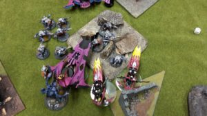 The Patriarch hit and wounded the enemy skimmer 5 times. Yaro failed one invulnerable and the Starweaver took a single wound. The Primus struck at the skimmer, wounding it once, but failing to get past its save.