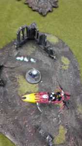 Yaro spread out in his deployment zone, one Starweaver and the two Skyweavers towards the back. One Starweaver took cover behind the ruins, joined by the Troupe Players on foot. The Death Jester took up position with them. The final Starweaver and Soltaire went a bit further forward, ready to advance on my forces.
