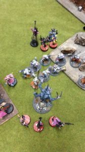 On the left flank, the Acolytes attacked. Some of the squad attacked the Troupe, causing three wounds on the squad. For once, Yaro failed his saves and the squad was killed. The Acolytes with Rock Cutters targeted the Spiritseer. Four attacks, hitting on a 4+, I was dismayed to roll four 3’s for my attacks! Some of the other Acolytes managed to put a single wound on the Spiritseer with their attacks.