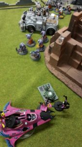 In the shooting phase, the Neophytes fired their mining laser at the forward Starweaver, hitting and wounding it, but failing to get past its invulnerable save. The Goliath Truck fired at the same skimmer, hitting and wounding once, but once more the Starweaver’s invulnerable save protected it. The Rockgrinder fired its Heavy Stubber at the vehicle, but failed to hit. The -1 to hit on the enemy skimmers was proving to be powerful against my army.
