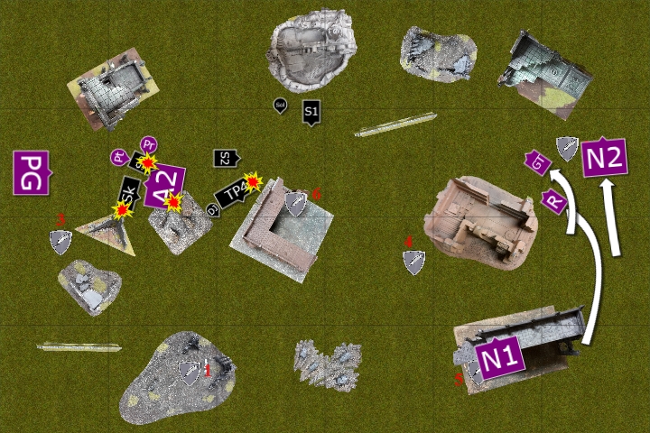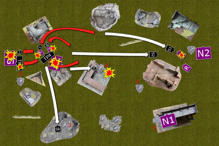 On my right flank, the two vehicles moved around the cover, as the Neophyte unit moved up on the objective. I then decided to launch my ambushes.