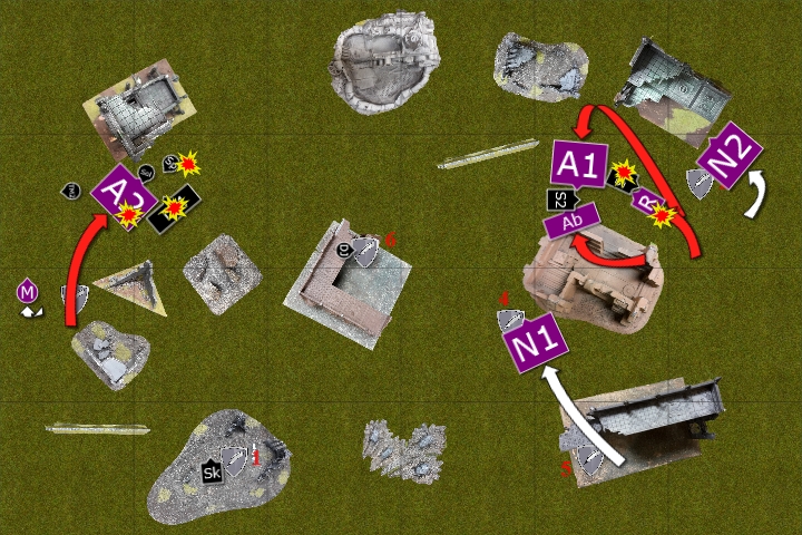 In the ruins to the south, the Neophyte Hybrids advanced out towards the objective. At the end of the phase, the final units of the ambush arrived. The Magus led the Acolytes towards the Troupe Master and other Harlequin characters.