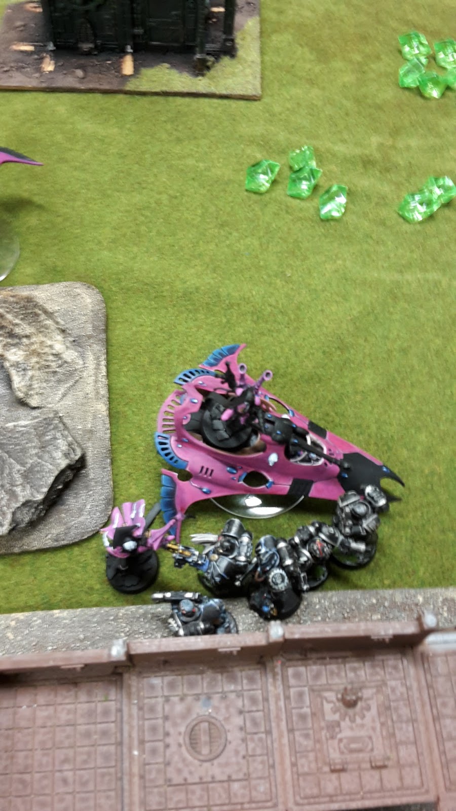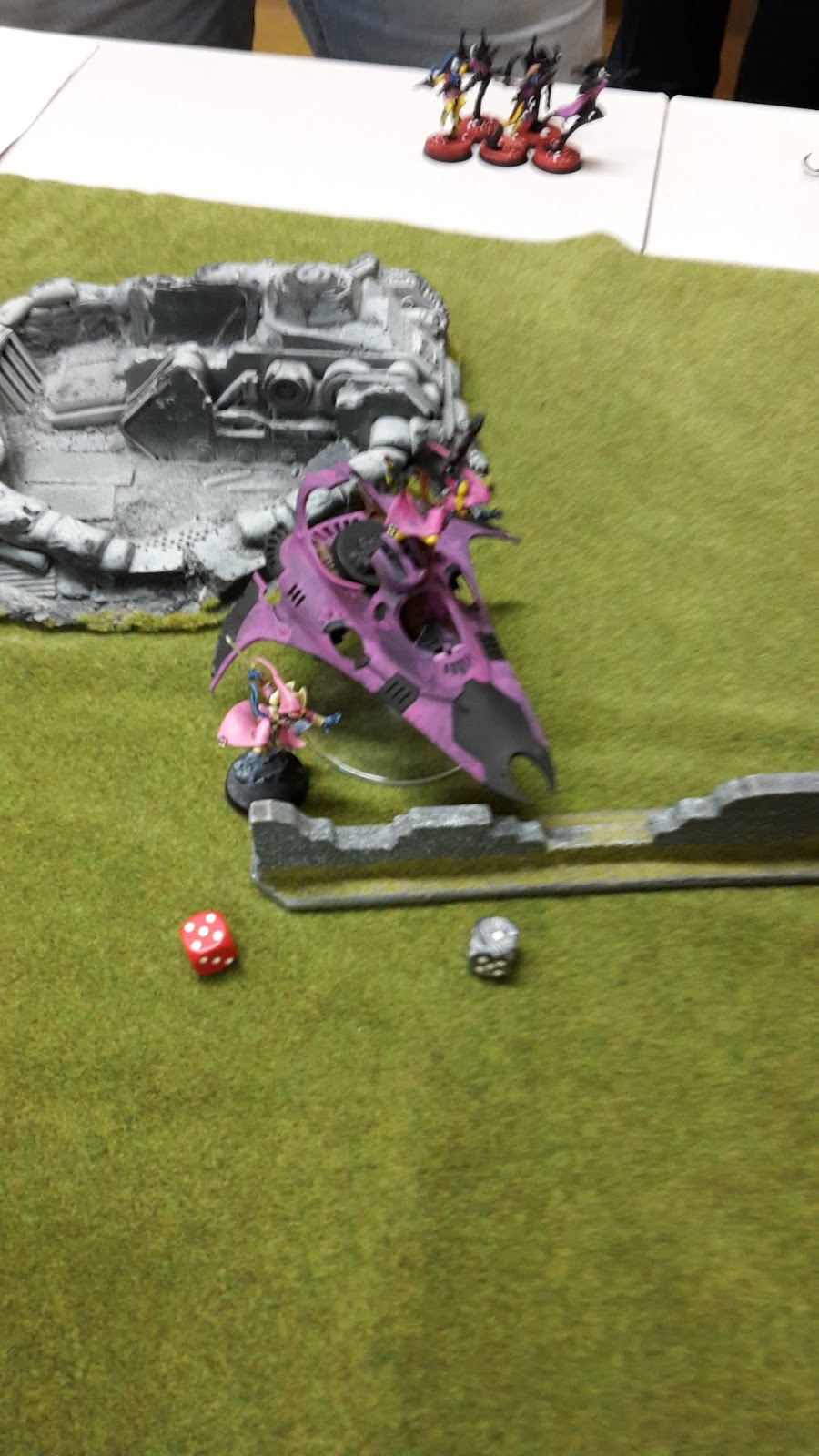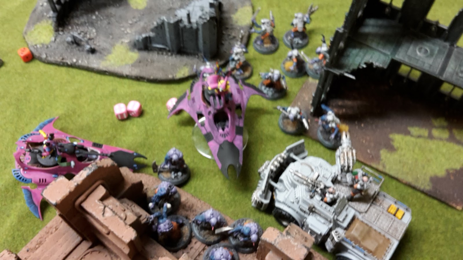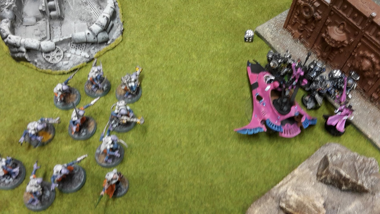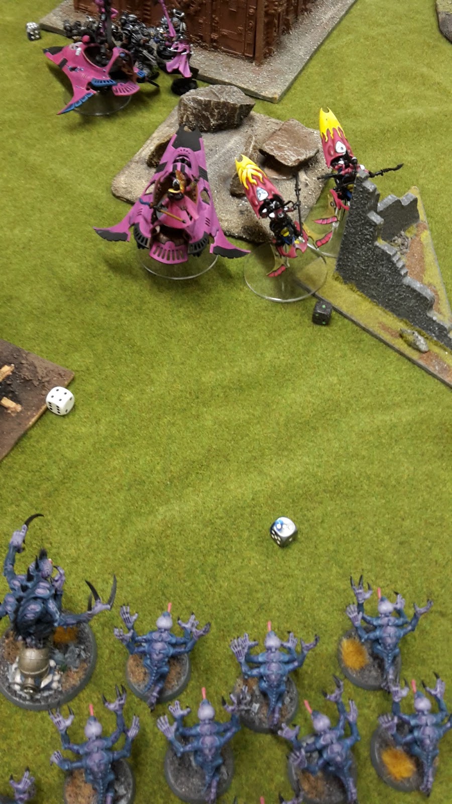 The Patriarch hit and wounded the enemy skimmer 5 times. Yaro failed one invulnerable and the Starweaver took a single wound. The Primus struck at the skimmer, wounding it once, but failing to get past its save.