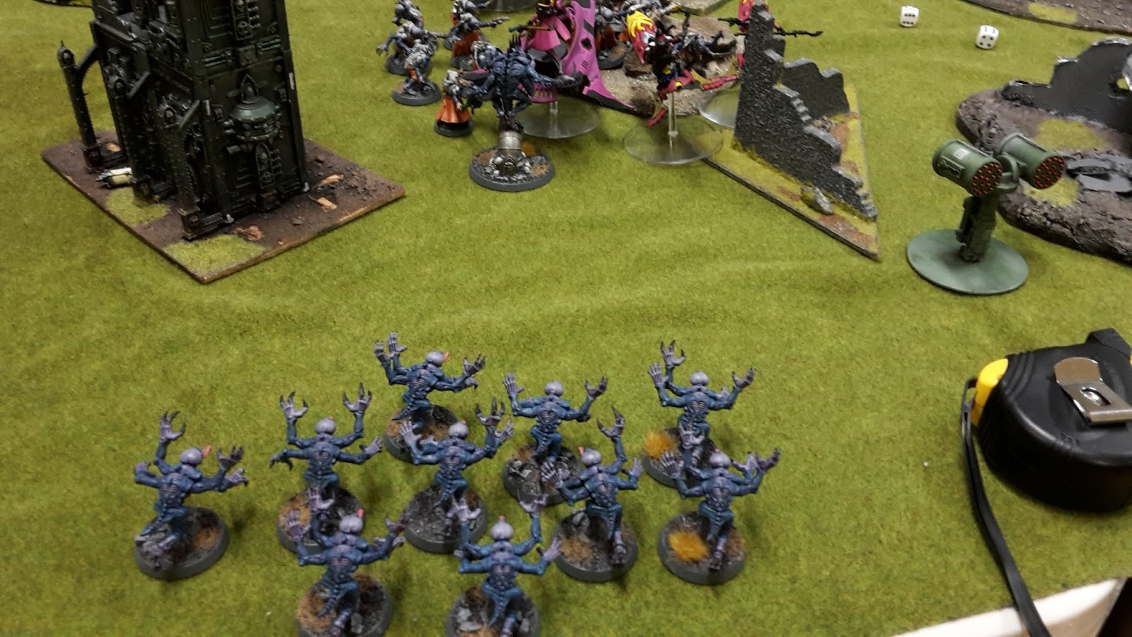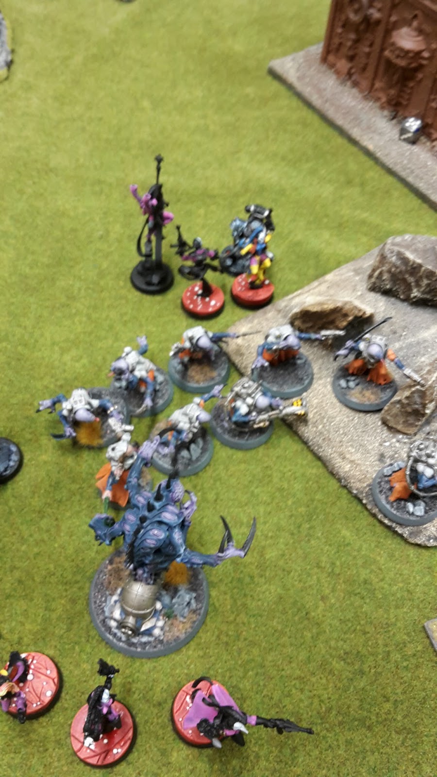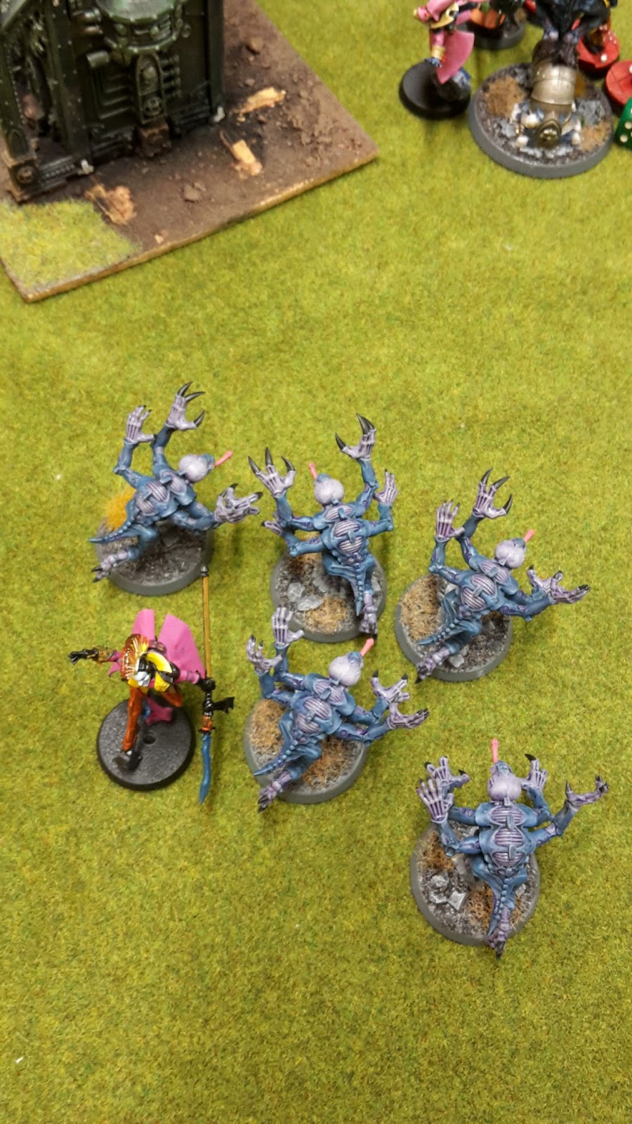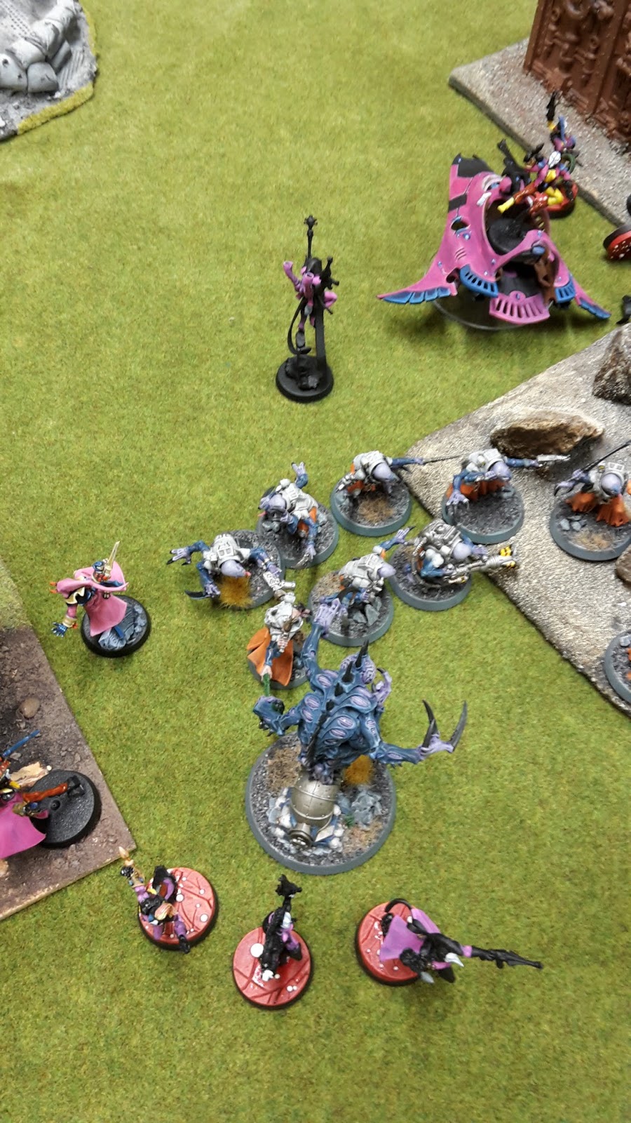 In the charge phase, the Starweaver, Skyweaver, Troupe Player and Troupe Master charged the Neophytes. The Soltaire attempted to charge the Aberrants, but failed to make the distance. The Spiritseer tried to charge the lone Acolyte, but failed as well.
