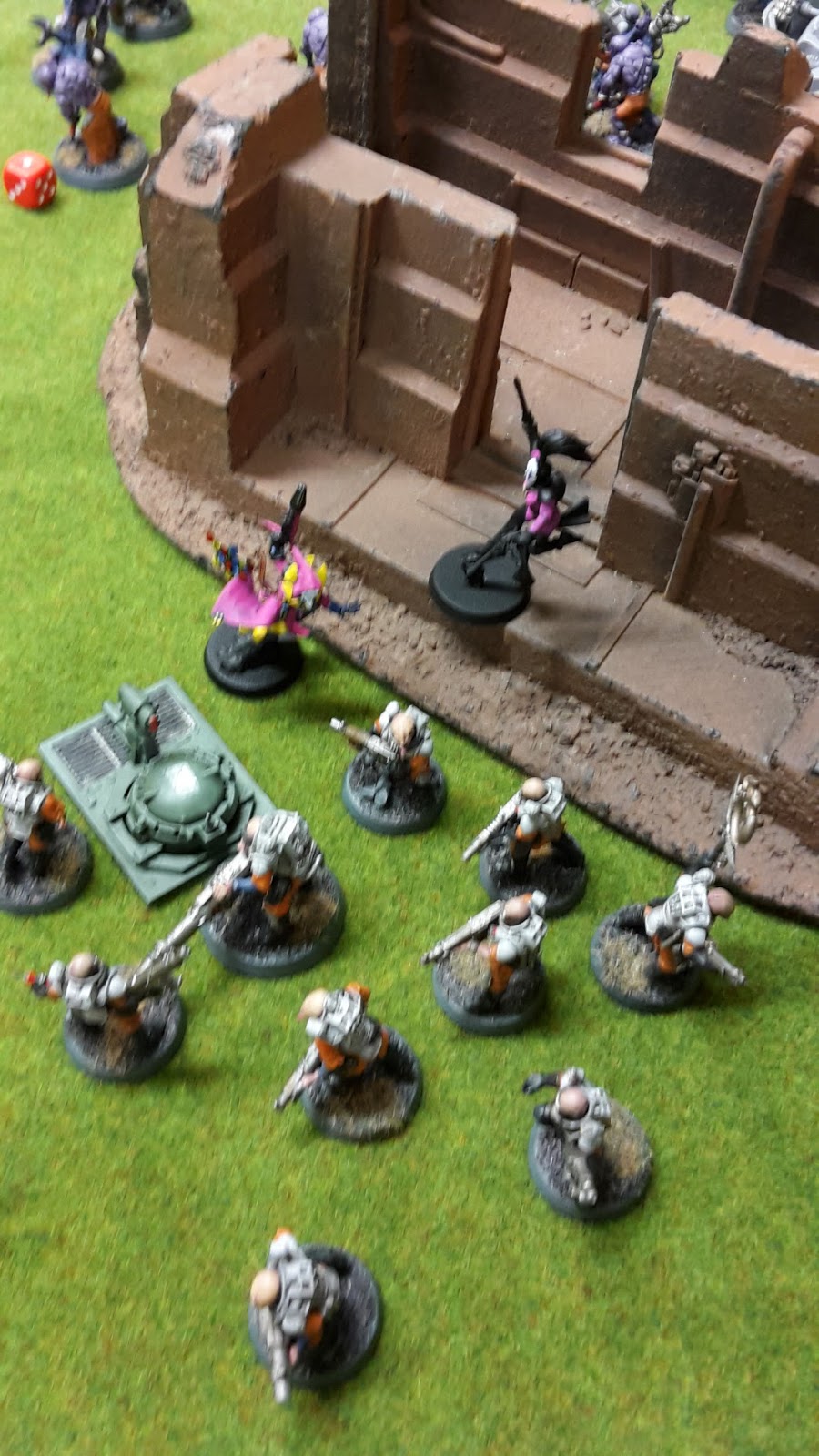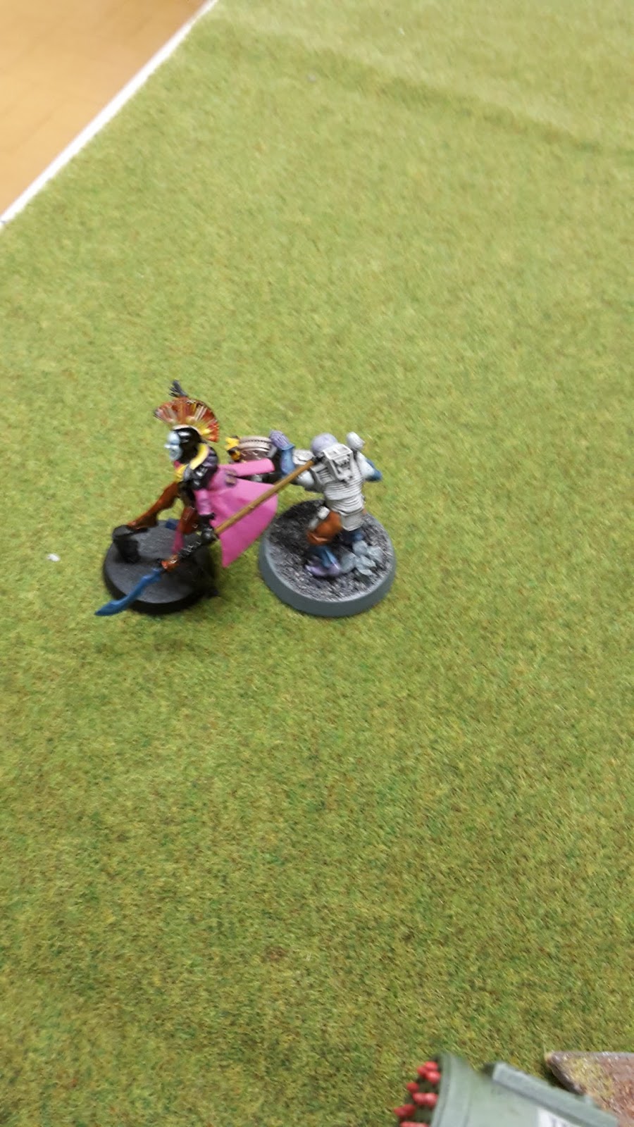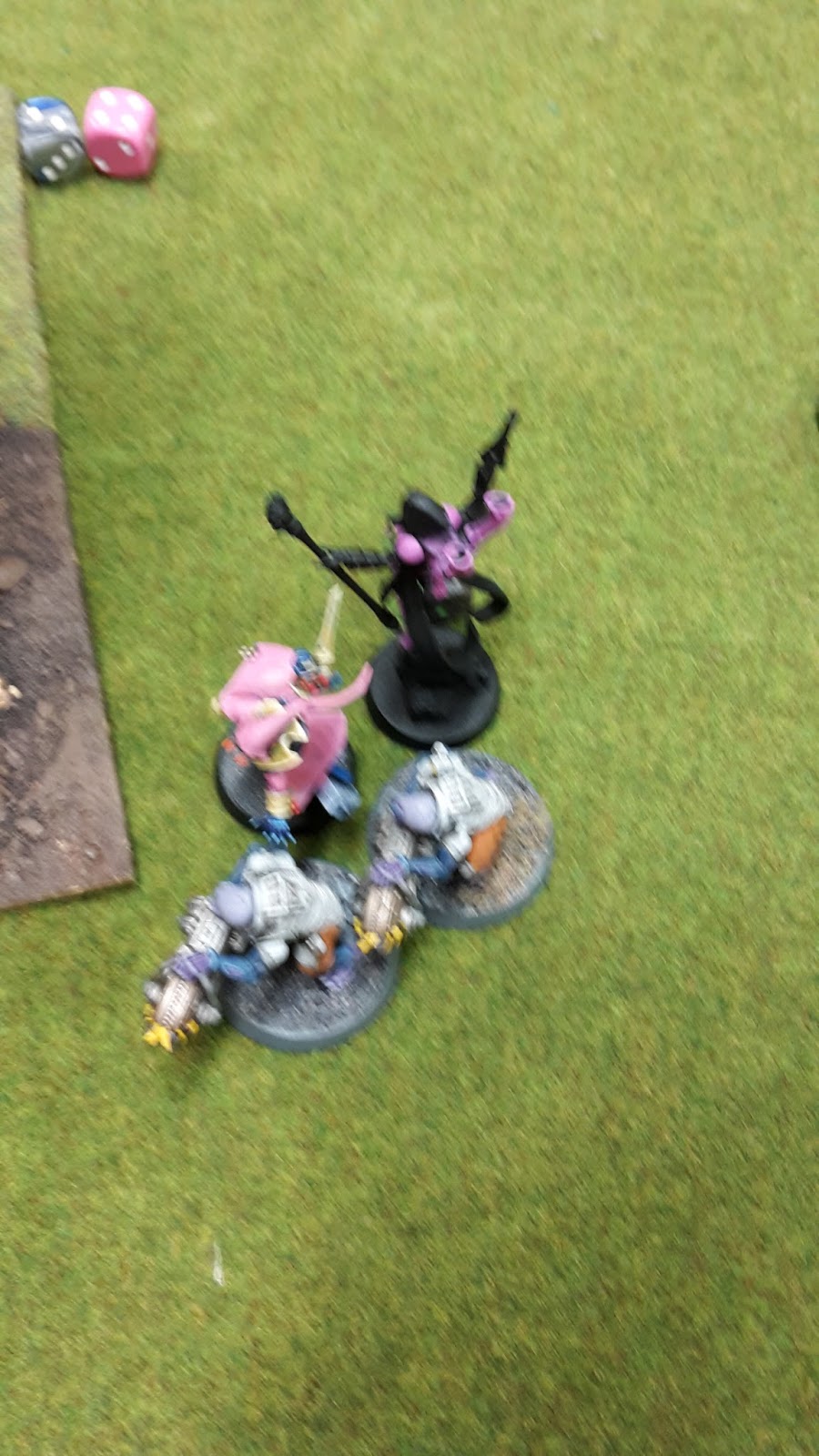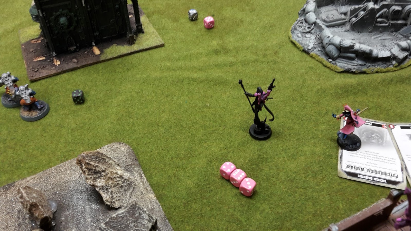 The Spiritseer threw his grenade, beating the Acolyte’s Leadership with an 11 and killing two more of the squad. The Troupe Master fired his Fusion Pistol at the Patriarch, hitting but failing to wound.