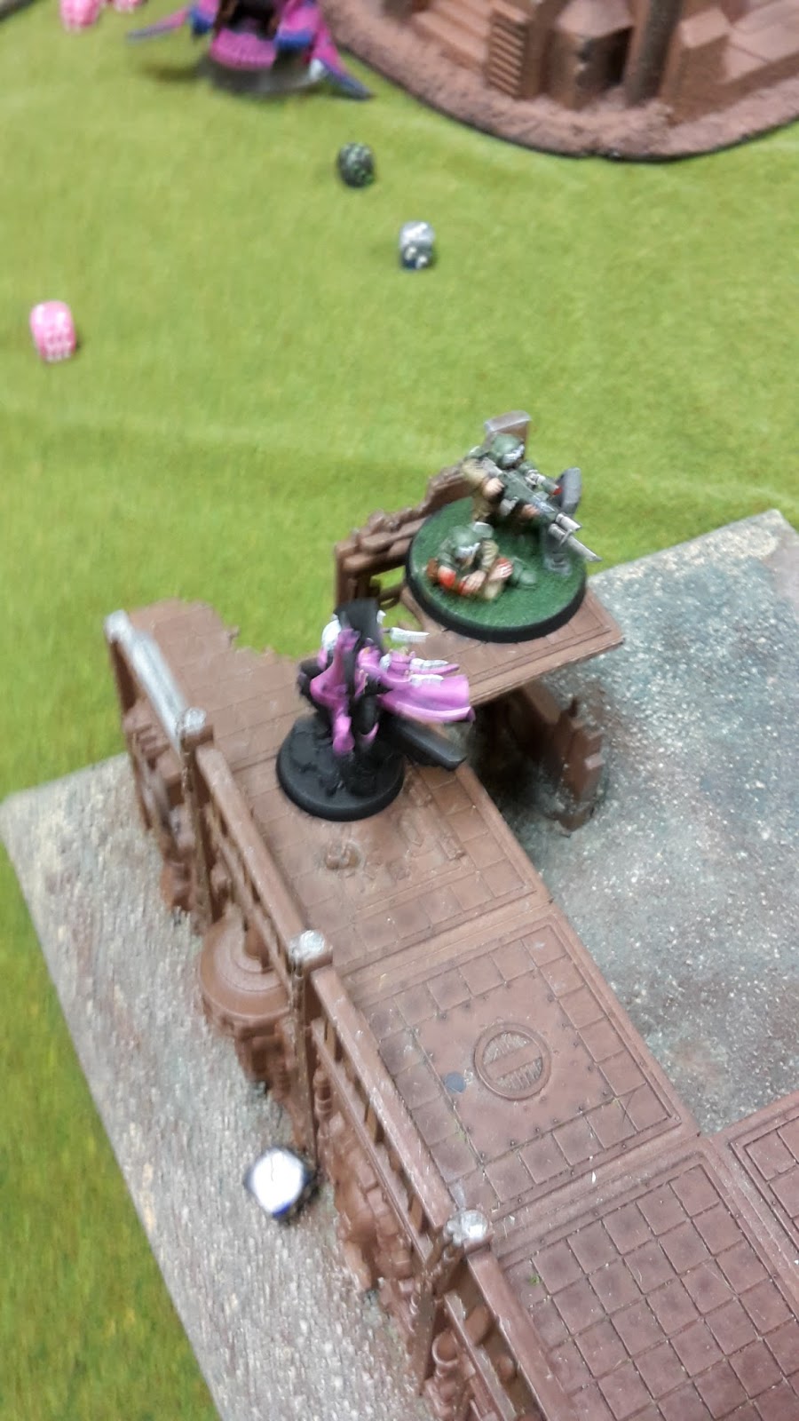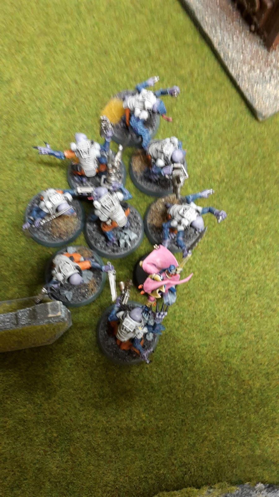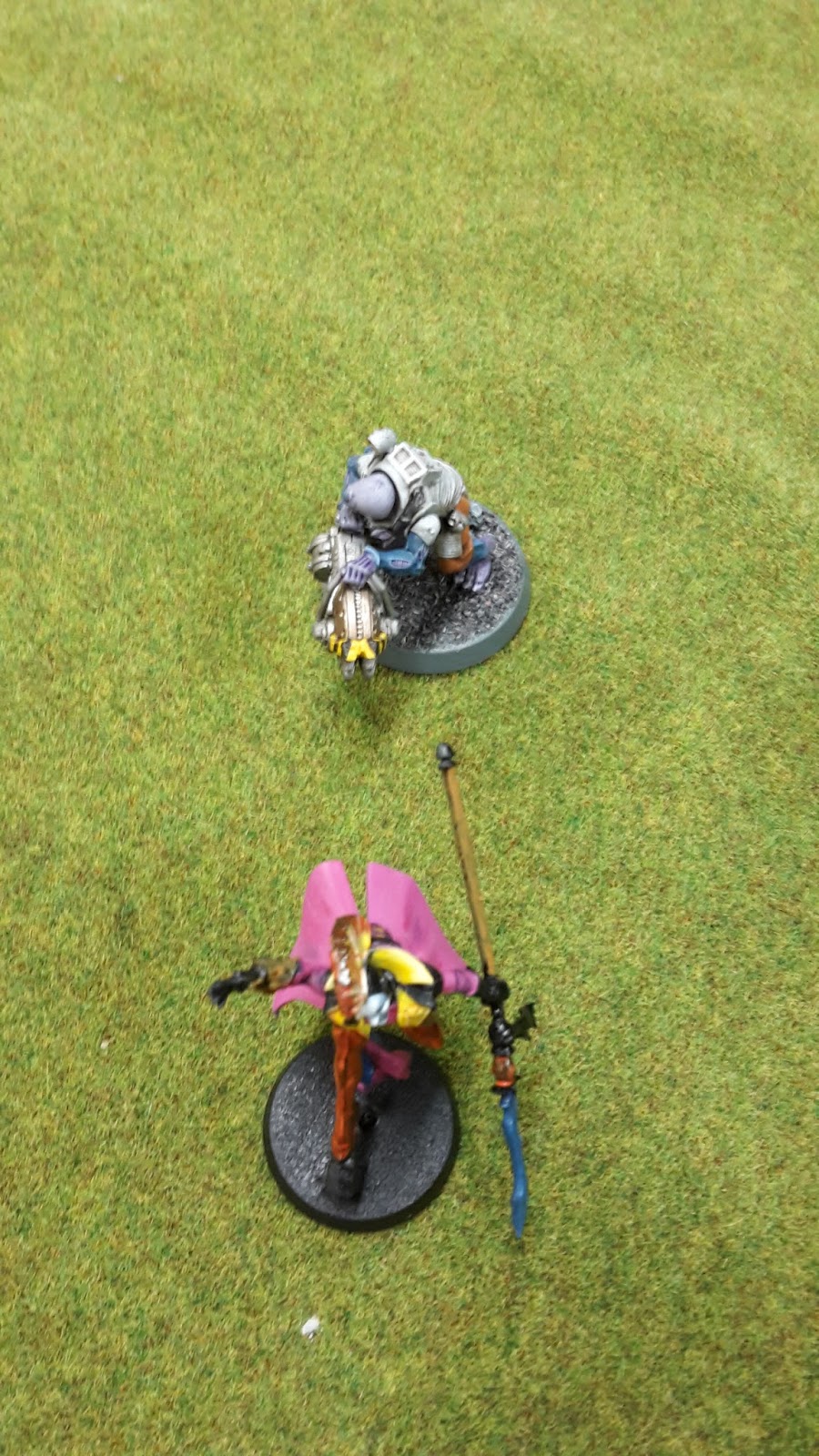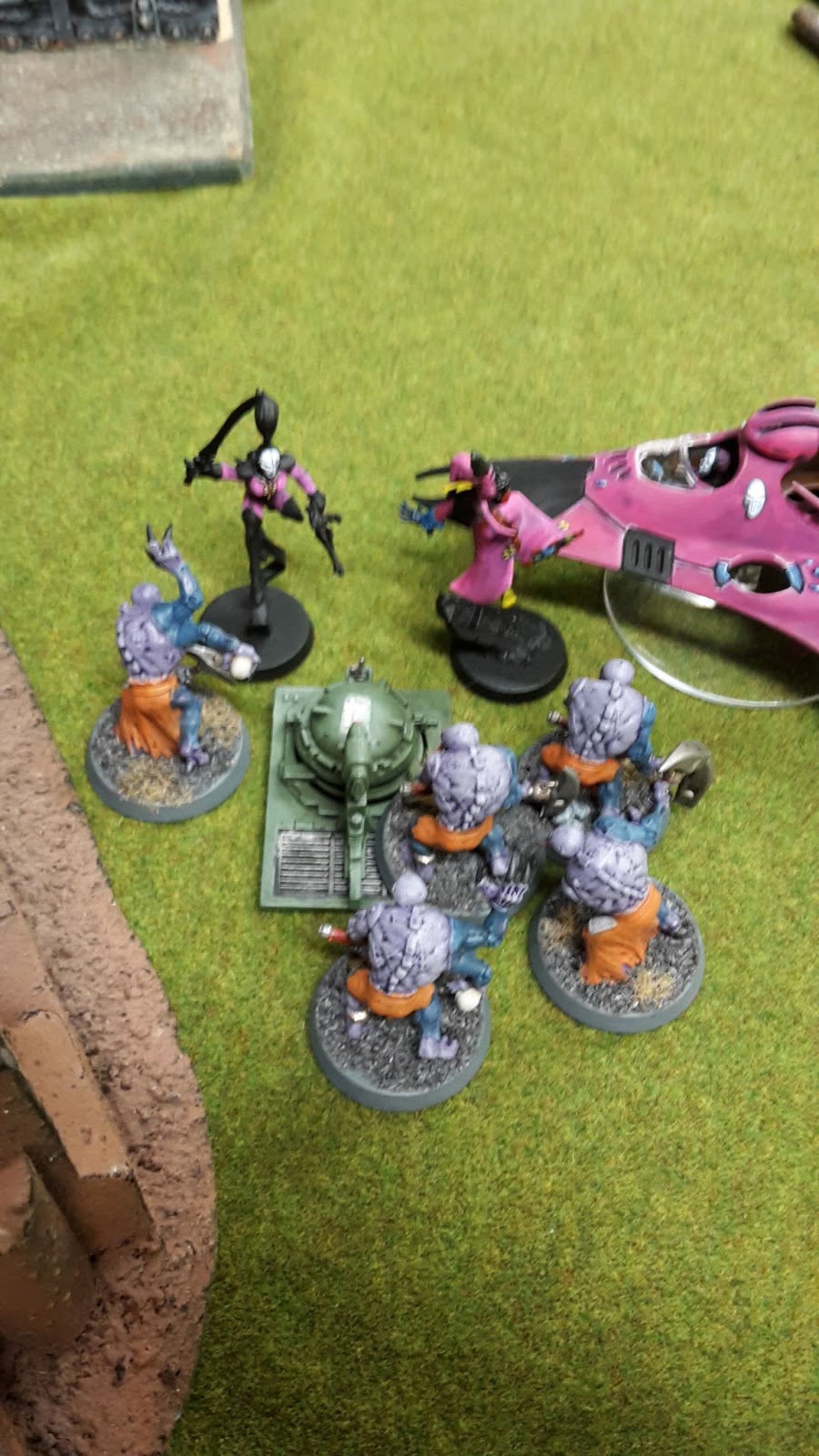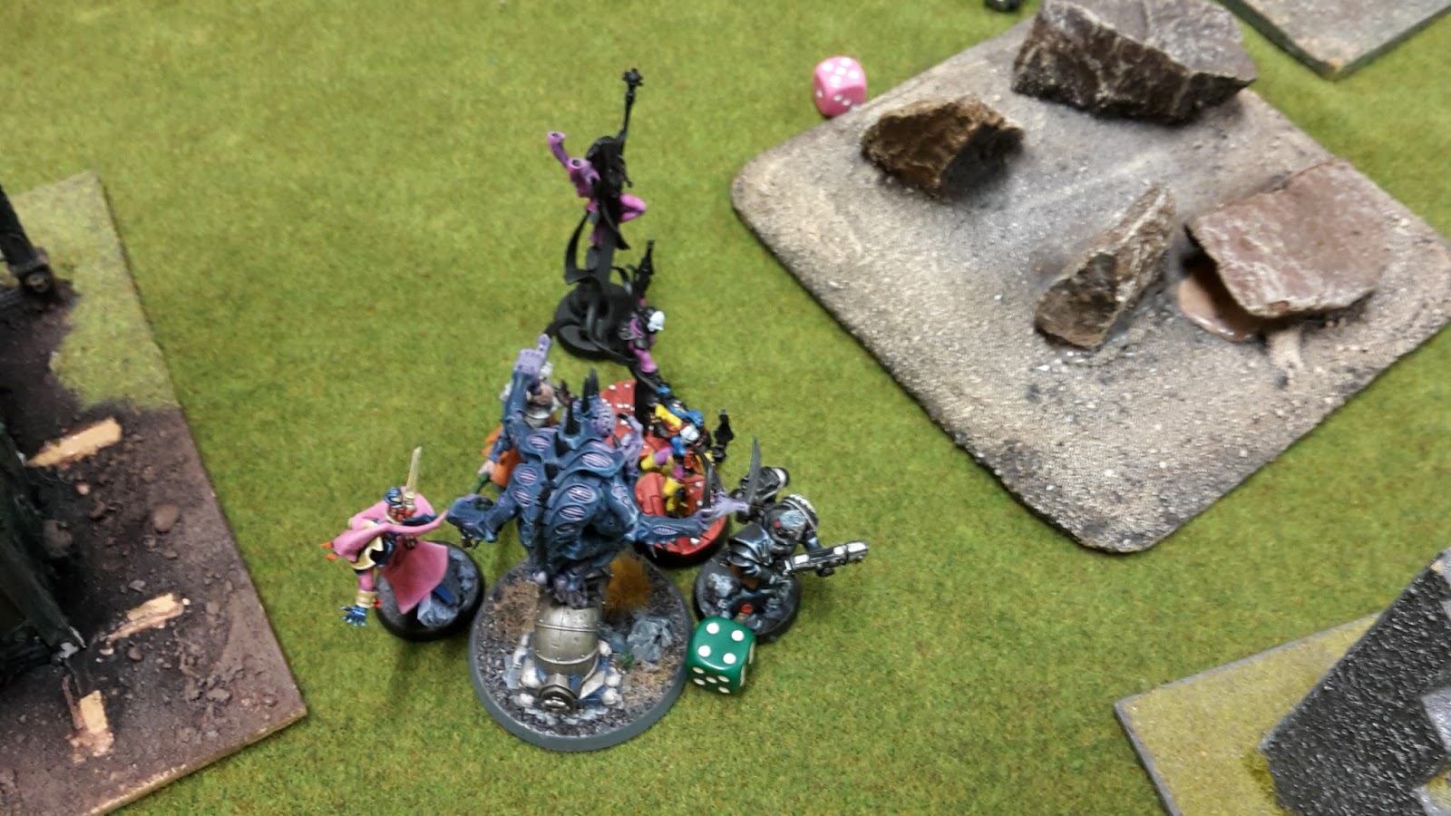 The Spiritseer threw his grenade, beating the Acolyte’s Leadership with an 11 and killing two more of the squad. The Troupe Master fired his Fusion Pistol at the Patriarch, hitting but failing to wound.