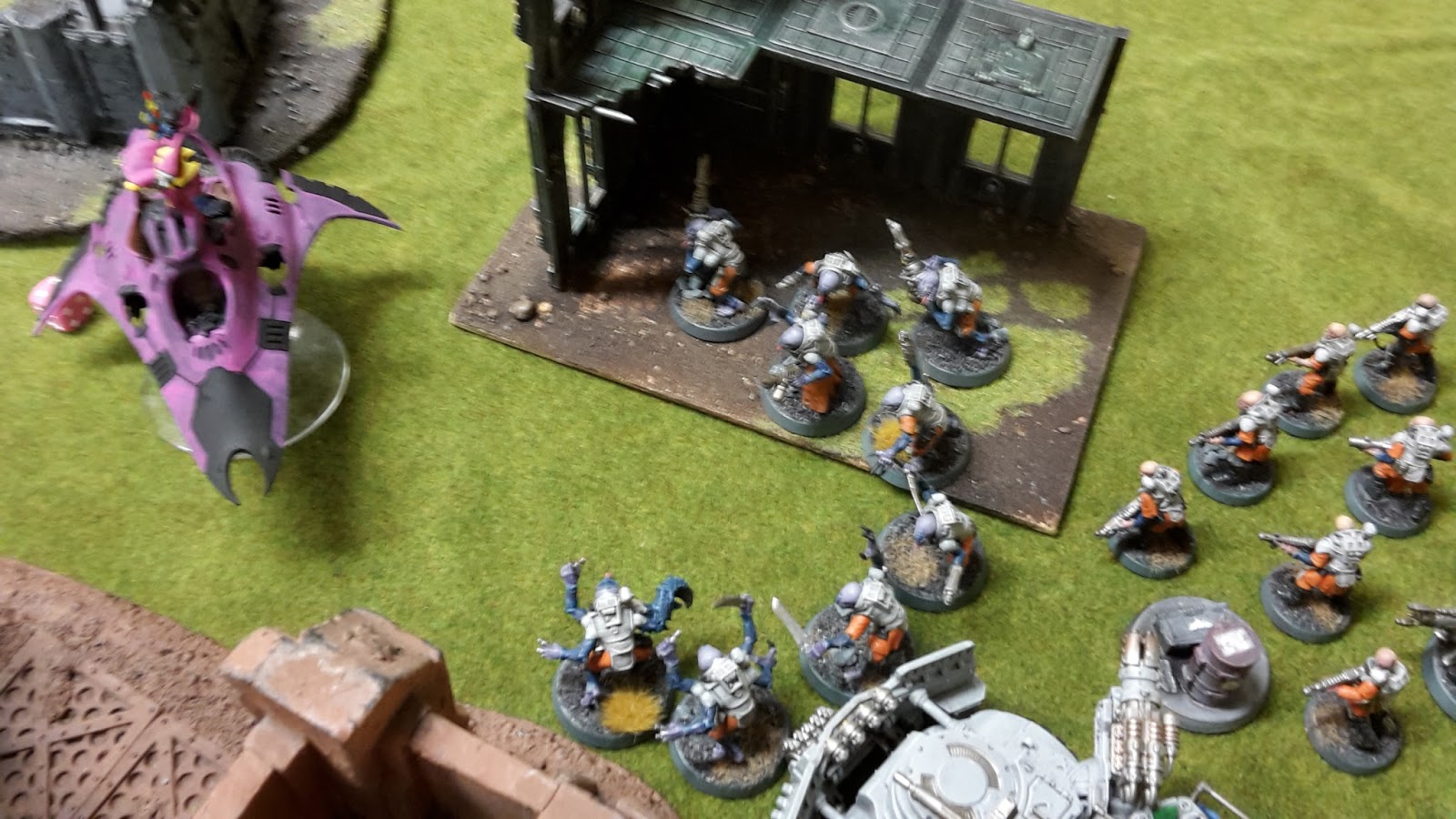 Finally, the Acolytes targeted the Warlord’s Starweaver. The squad did 7 wounds on the skimmer, destroying it. Three of the squad died emerging from the vehicle. Due to model placement, only two of the squad could be deployed, so a single Troupe Player and the Troupe Master were deployed.