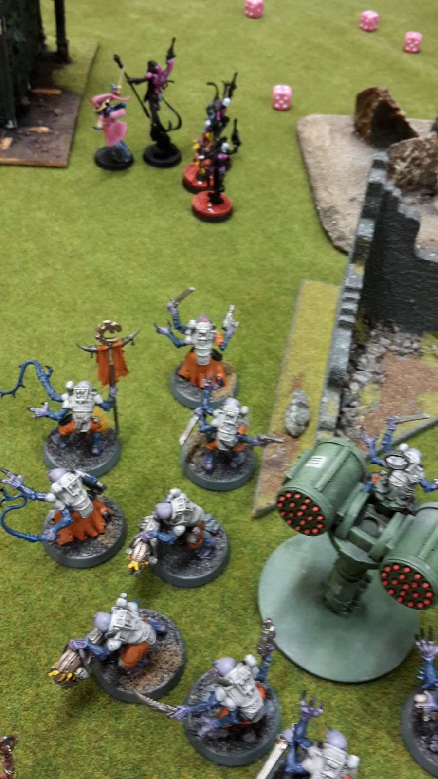 On the other side of the field, the Acolytes fired their pistols at the Troupe Players, scoring only 2 hits with their 8 shots and killing one of the squad. The Primus fired his Pistol at the squad, killing another of the capering Aeldari.