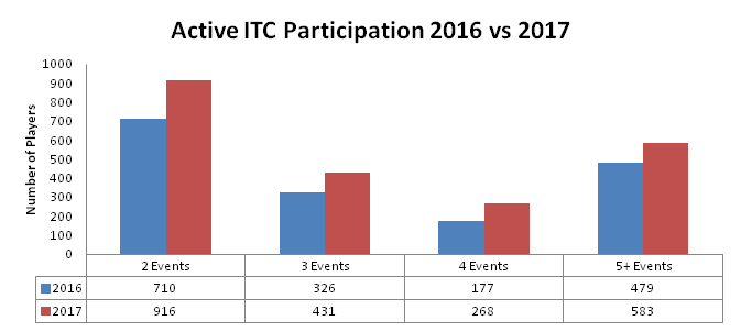 While the single event set saw piddly growth of 2% since 2016 – the active tournament crowd has increased 30% since last year! That means that there are 30% more people battling for the individual faction crowns and overall ITC rankings. This is a sign to me that people are not only trying ITC tournaments more, but they’re also seeking out more ITC tournaments to play in.