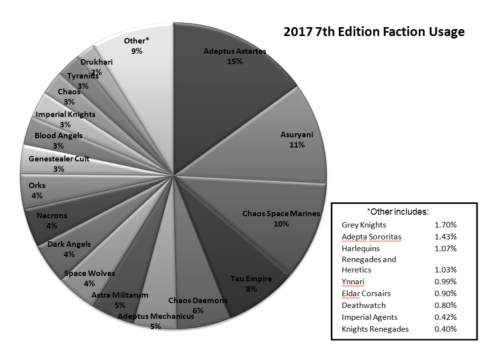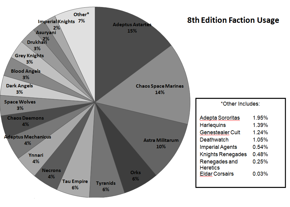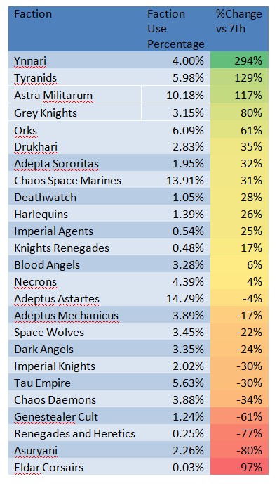 Sure power armoured murder monks still rule the day – but look at Orks and Tyranids! And where did Eldar go? Answer: devoured by the slaneeshi pleasure of no longer being bound to a faction you’re just not that into. Seriously – Eldar’s usage implodes with the switch to 8th edition. Combining Ynnari and Asuryani still gets you barely half of the total eldar players that were present in the meta just six months ago.