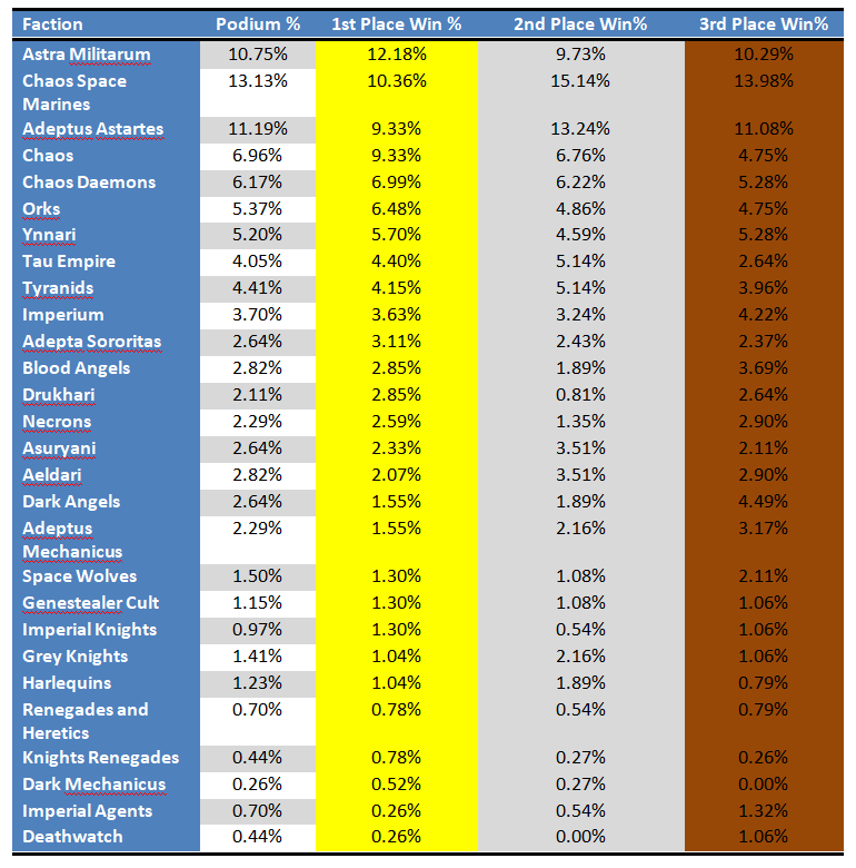 In the above average camp – there are certainly some outliers buoyed by small sample size here. I wouldn’t be anticipating the dark mechanicus meta, or understating the death of Genestealer Cult (they are basically extinct since NOVA). However armies with large samples and excellent results like Chaos faction, Daemons and Ynnari are either attracting skilled pilots, or are every bit deserving of the significant nerf bat that they collectively just took to the face.