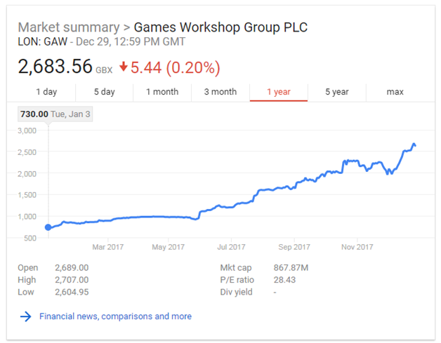 Oh and by the way – there’s about 32 million Games Workshop shares up for grabs. Doing a little math that means that all of GWs stock is worth roughly £867,682,200. Using our friends at google to convert that to freedom dollars you get: $1,172,672,493