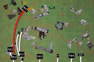With little in range, the Crawler fired at the Black Knights. The mortar fired at the Ravenwing Bikers, but failed to hit them thanks to the presence of the nearby Darkshroud.